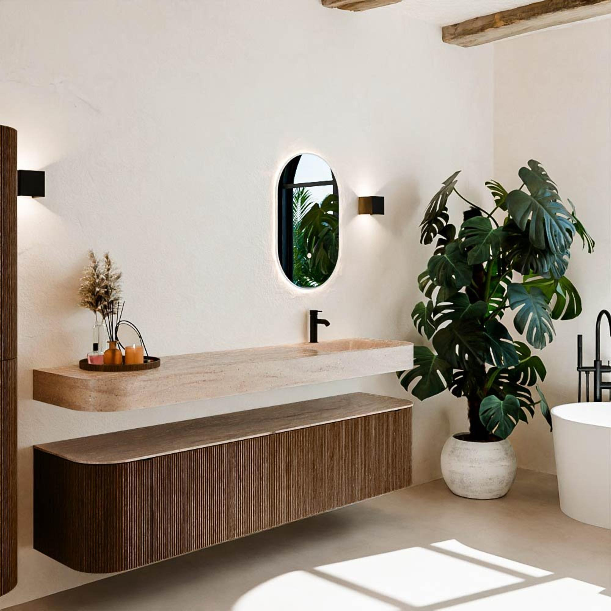 Matériaux naturels aux teintes chaudes. Les nervures verticales apportent rythme et texture au design, tandis que le chêne confère une apparence chaleureuse et artisanale. Choisissez parmi 5 teintes de bois OAK, WALNUT, DUSK, SHADOW et RUBY, des couleurs de bois soigneusement sélectionnées pour enrichir les salles de bains modernes et classiques.