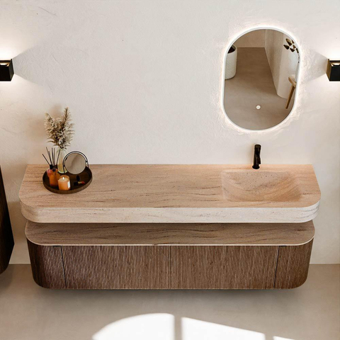 Au-dessus du meuble flotte une vasque suspendue assortie aux coins arrondis – parfaitement adaptée à la forme du meuble. La vasque est réalisée en Solid Surface et suit subtilement les lignes du meuble inférieur, créant un ensemble harmonieux. Le plateau en Solid Surface constitue une base solide et facile d'entretien et complète la combinaison.