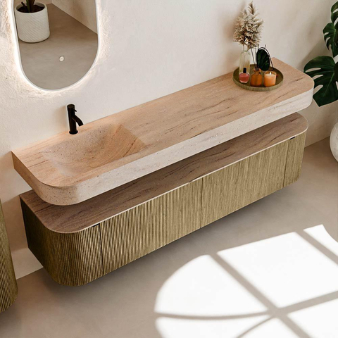 Matériaux naturels aux teintes chaudes. Les reliefs verticaux apportent rythme et texture au design, tandis que le chêne confère une apparence chaleureuse et artisanale. Choisissez parmi 5 teintes de bois OAK, WALNUT, DUSK, SHADOW et RUBY, des couleurs de bois soigneusement sélectionnées pour enrichir les salles de bains modernes et classiques.