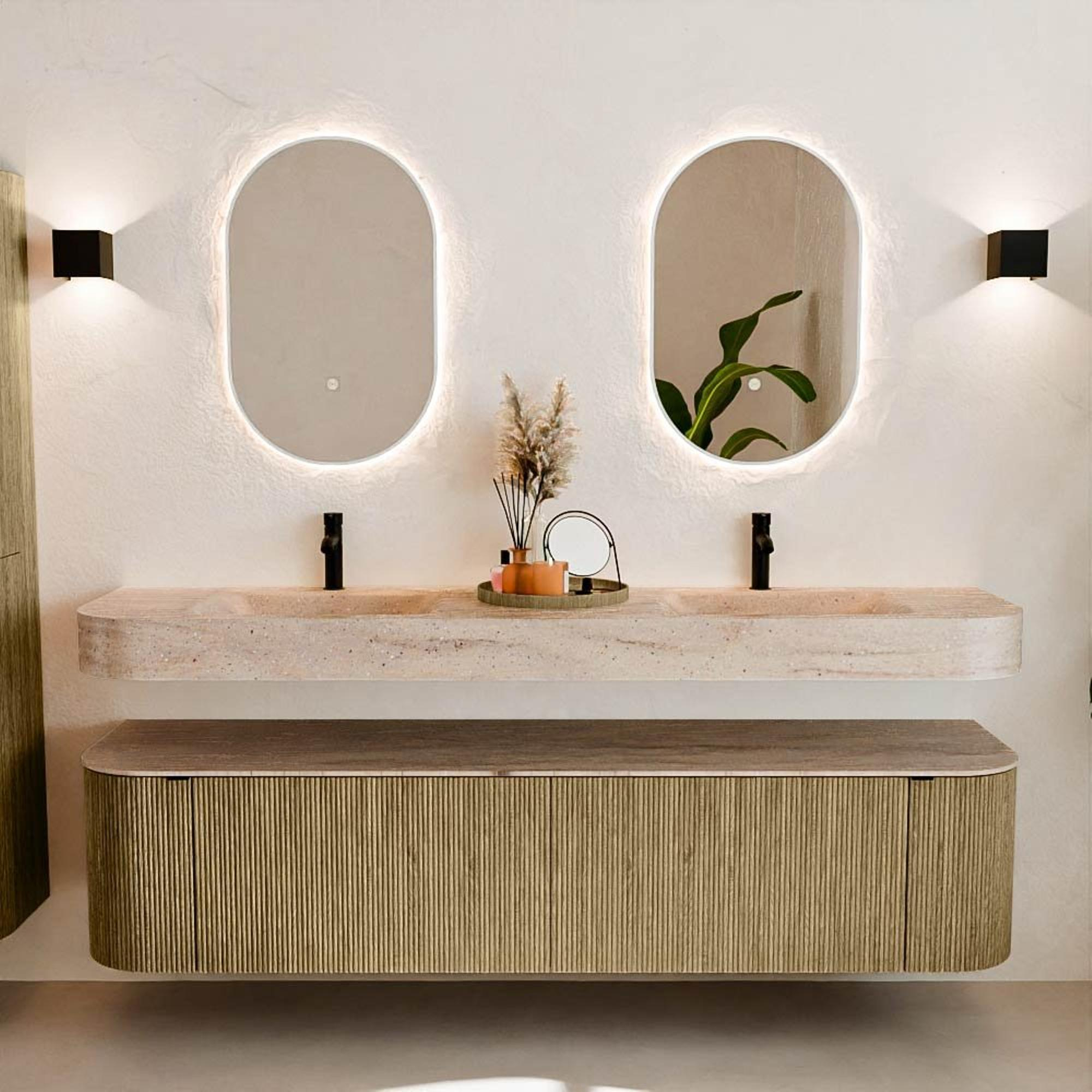 Matériaux naturels dans des tons chauds. Les rainures verticales apportent rythme et texture au design, tandis que le chêne confère une apparence chaleureuse et artisanale. Choisissez parmi 5 teintes de bois OAK, WALNUT, DUSK, SHADOW et RUBY, des couleurs de bois soigneusement sélectionnées pour enrichir les salles de bains modernes et classiques.