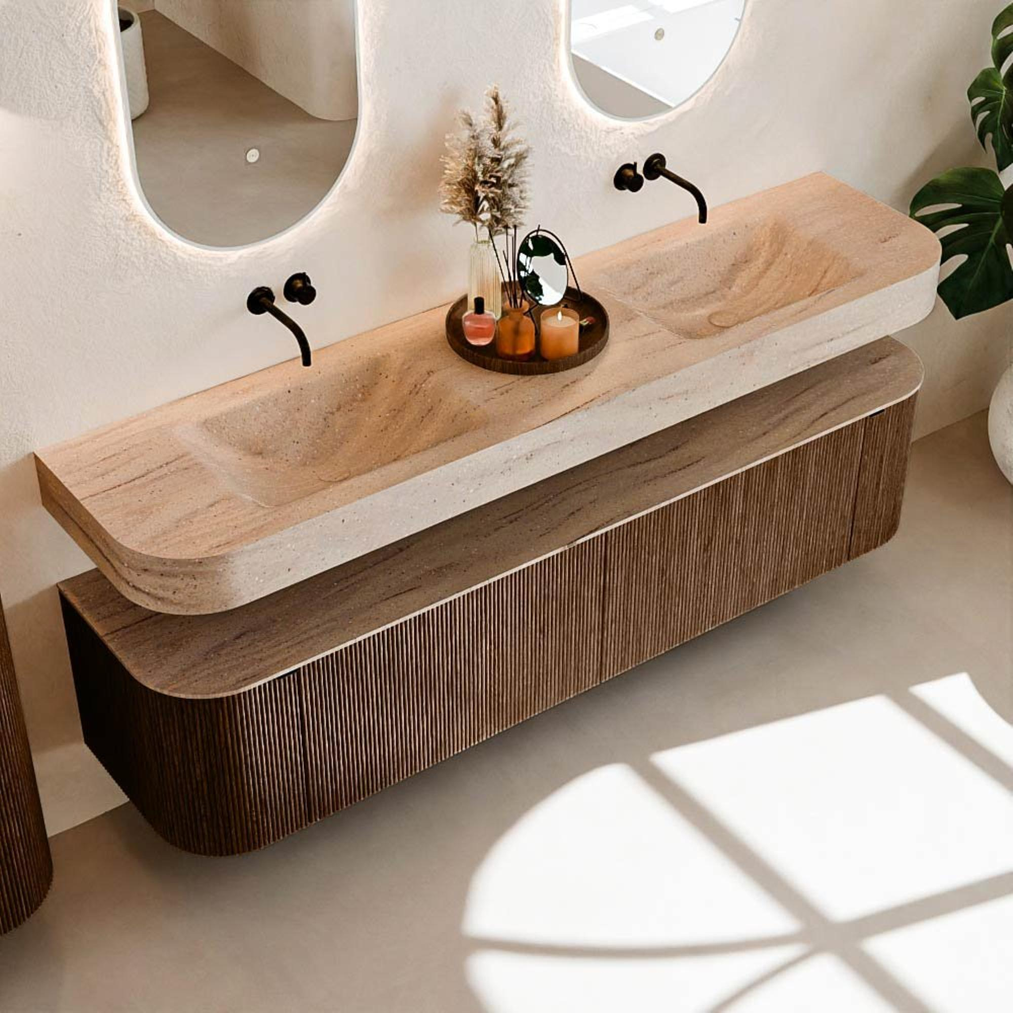 MONDIAZ THOR-DLUX Meuble de salle de bains - 190cm - arrondi gauche + droite - couleur Walnut - 2 tiroirs et 2 portes - Vasque suspendue CLOUD Double sans trou de robinet - couleur Saba