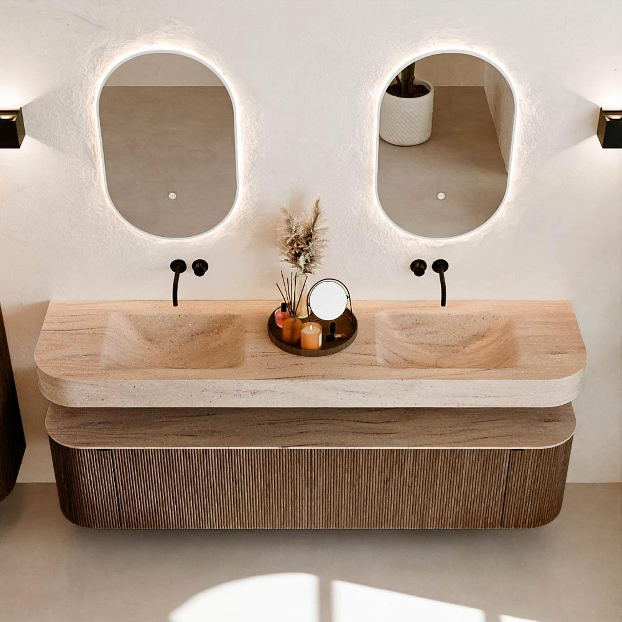 Matériaux naturels dans des tons chauds. Les reliefs verticaux apportent rythme et texture au design, tandis que le chêne confère une apparence chaleureuse et artisanale. Choisissez parmi 5 teintes de bois OAK, WALNUT, DUSK, SHADOW et RUBY, des couleurs de bois soigneusement sélectionnées pour enrichir les salles de bains modernes et classiques.
