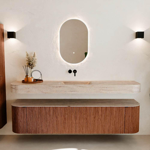 Matériaux naturels aux teintes chaudes. Les nervures verticales apportent rythme et texture au design, tandis que le chêne confère une apparence chaleureuse et artisanale. Choisissez parmi 5 teintes de bois OAK, WALNUT, DUSK, SHADOW et RUBY, des couleurs de bois soigneusement sélectionnées pour enrichir les salles de bains modernes et classiques.