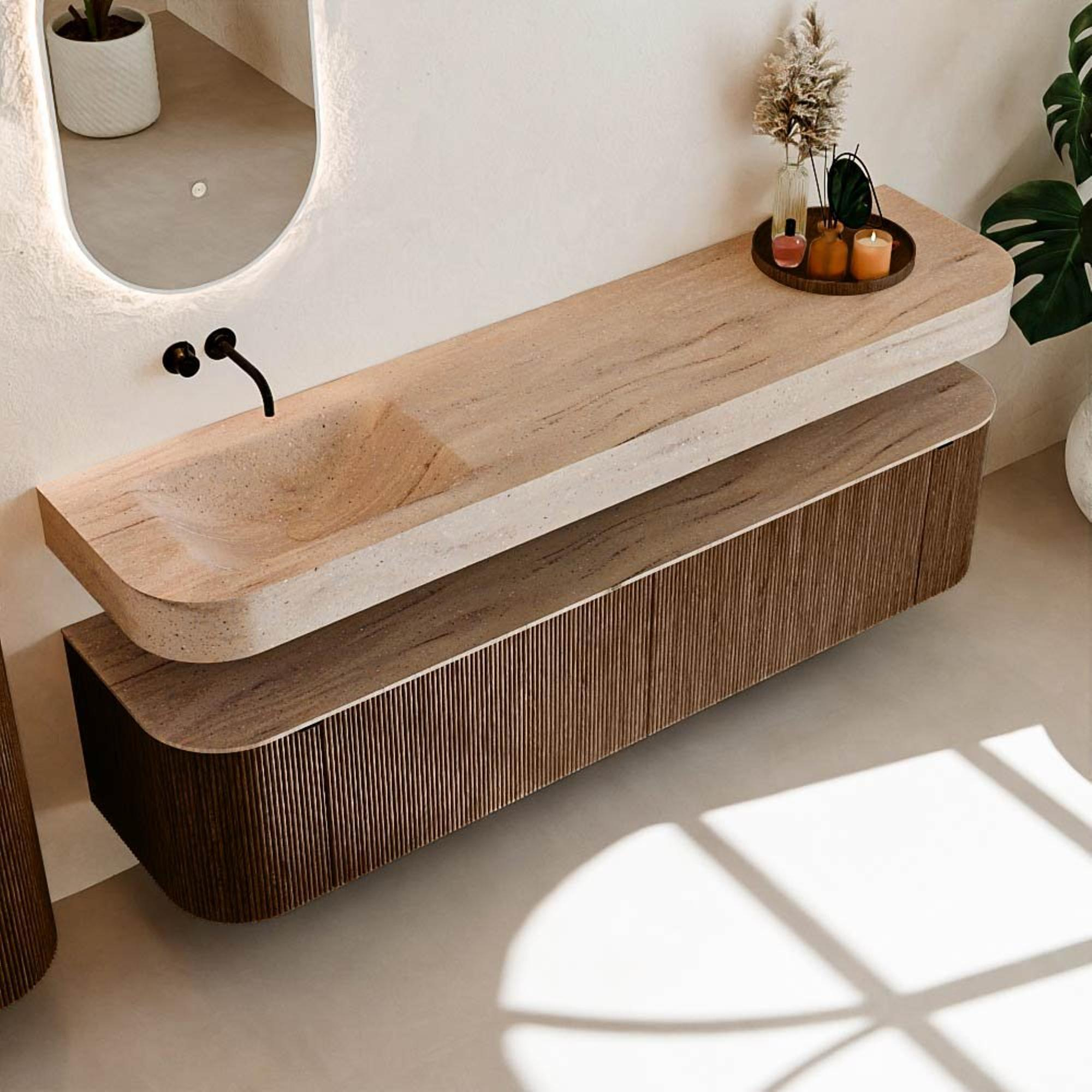 Matériaux naturels dans des tons chauds. Les nervures verticales apportent rythme et texture au design, tandis que le chêne confère une apparence chaleureuse et artisanale. Choisissez parmi 5 teintes de bois OAK, WALNUT, DUSK, SHADOW et RUBY, des couleurs de bois soigneusement sélectionnées pour enrichir les salles de bains modernes et classiques.
