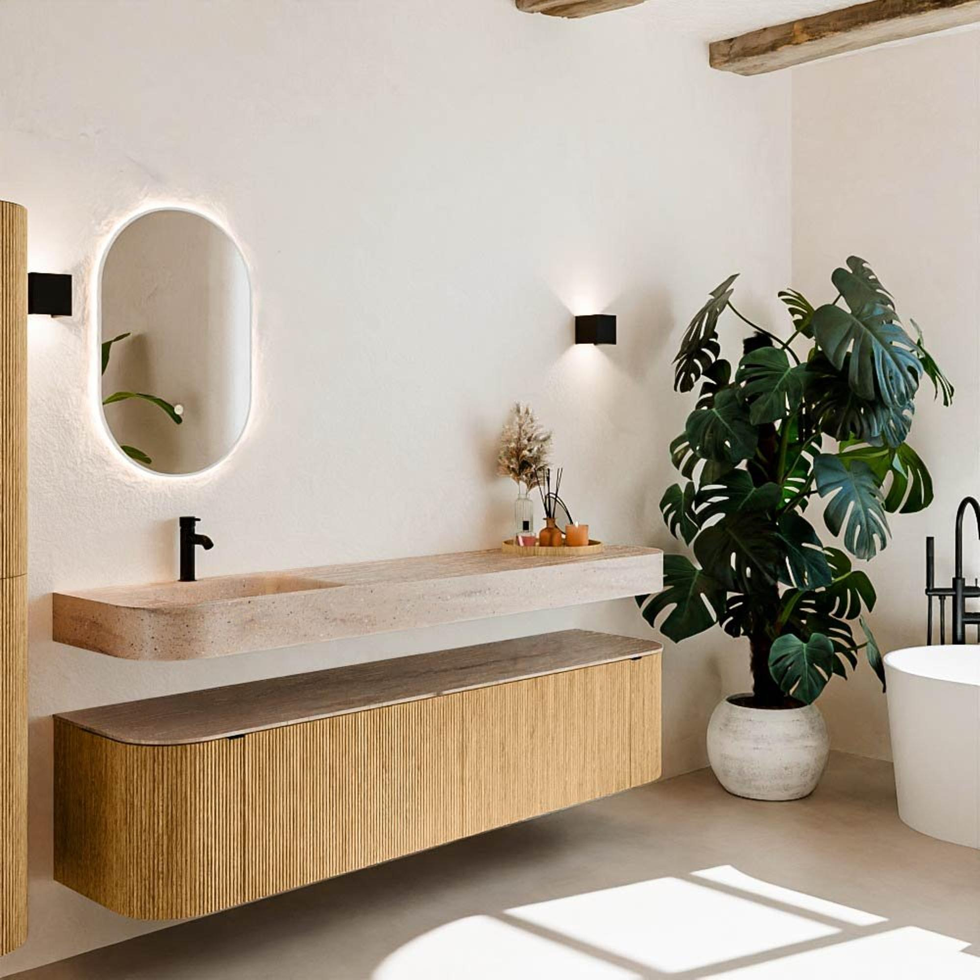 Matériaux naturels dans des tons chauds. Les nervures verticales apportent rythme et texture au design, tandis que le chêne confère une apparence chaleureuse et artisanale. Choisissez parmi 5 teintes de bois CHÊNE, NOYER, DUSK, SHADOW et RUBY, des couleurs de bois soigneusement sélectionnées pour enrichir les salles de bains modernes et classiques.