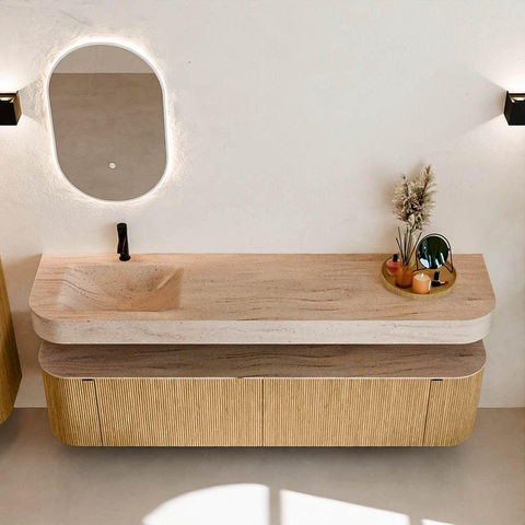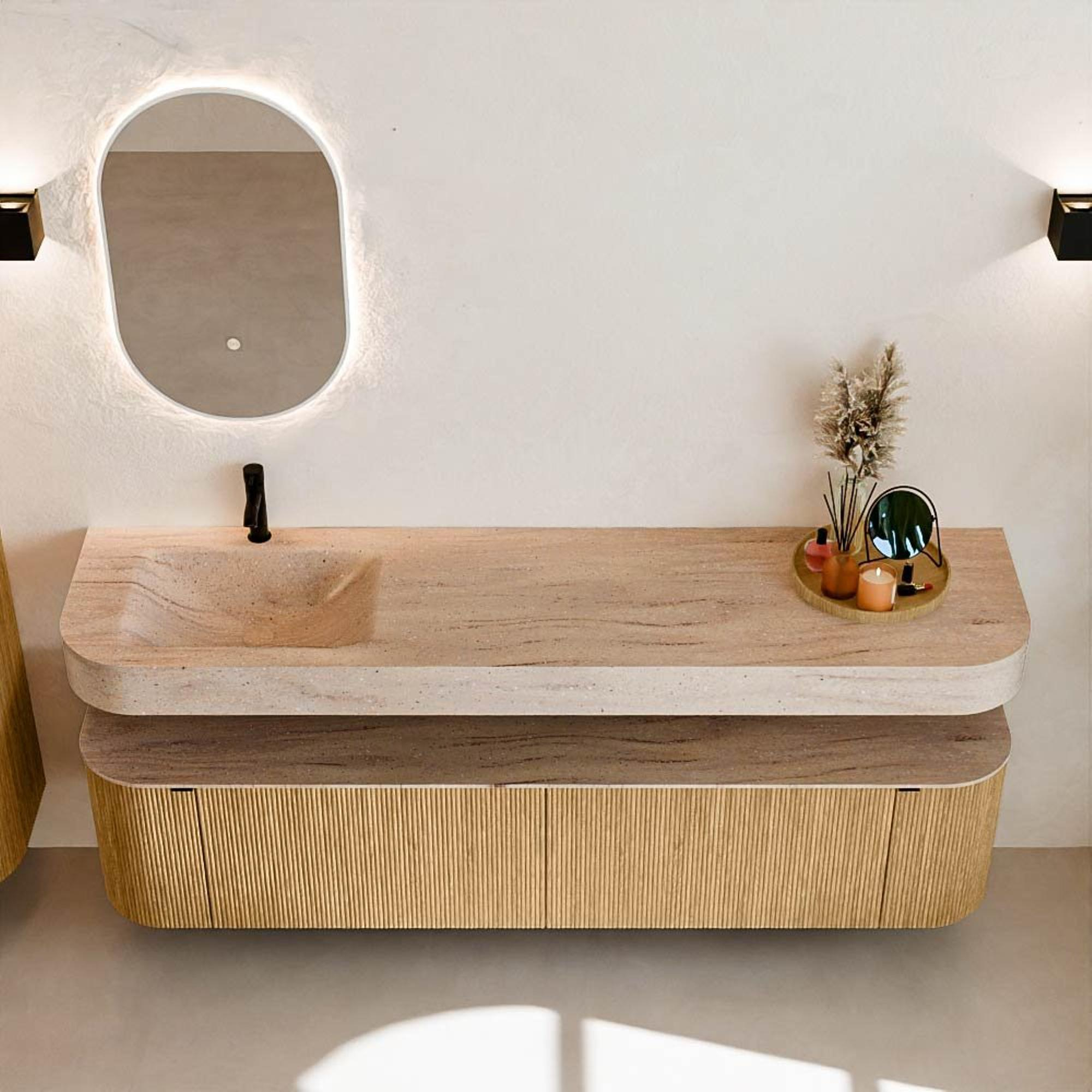 Au-dessus du meuble flotte une vasque suspendue assortie aux coins arrondis – parfaitement adaptée à la forme du meuble. La vasque est réalisée en Solid Surface et suit subtilement les lignes du meuble inférieur, créant ainsi un ensemble harmonieux. Le plan de travail en Solid Surface constitue une base solide et facile d'entretien, complétant la combinaison.