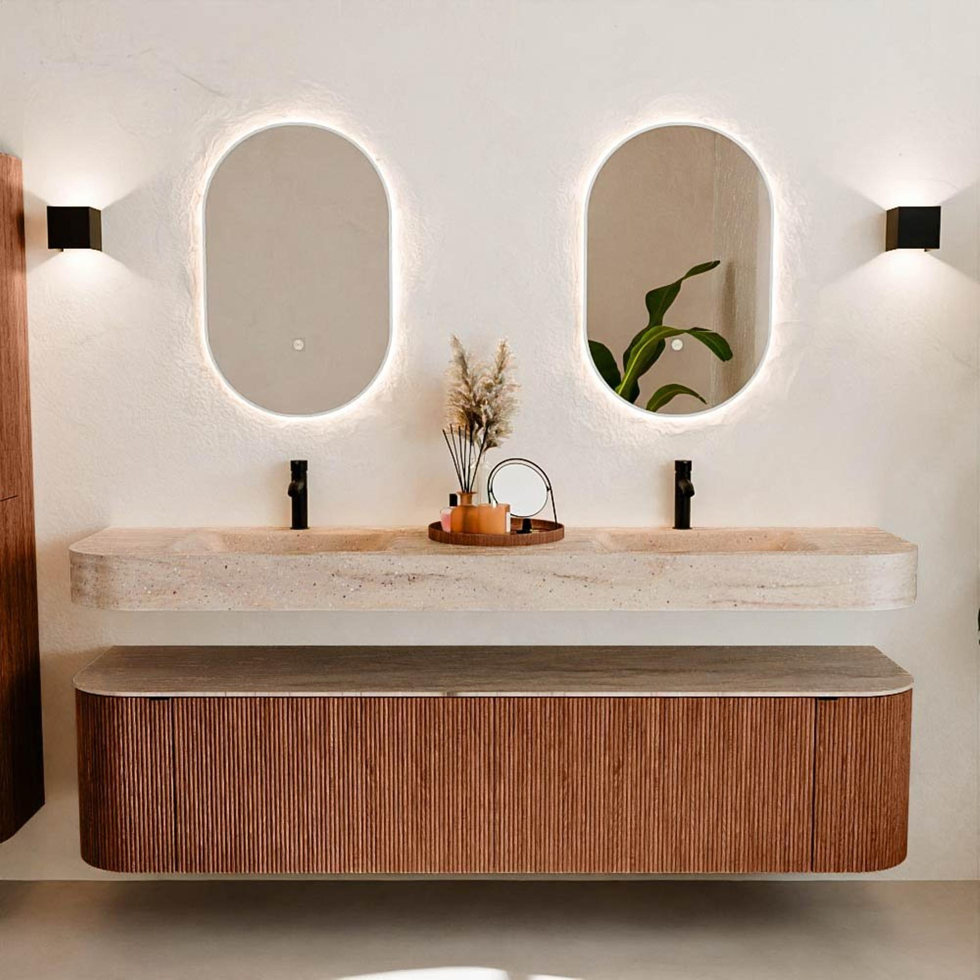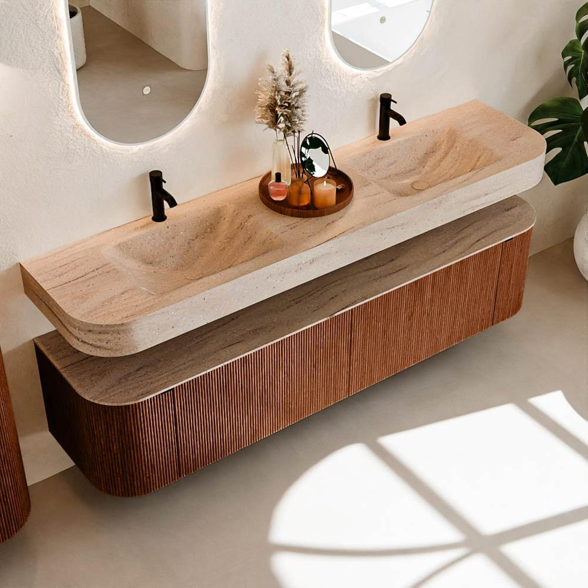 Matériaux naturels dans des tons chauds. Les nervures verticales apportent rythme et texture au design, tandis que le chêne confère une apparence chaleureuse et artisanale. Choisissez parmi 5 teintes de bois OAK, WALNUT, DUSK, SHADOW et RUBY, des couleurs de bois soigneusement sélectionnées pour enrichir les salles de bains modernes et classiques.