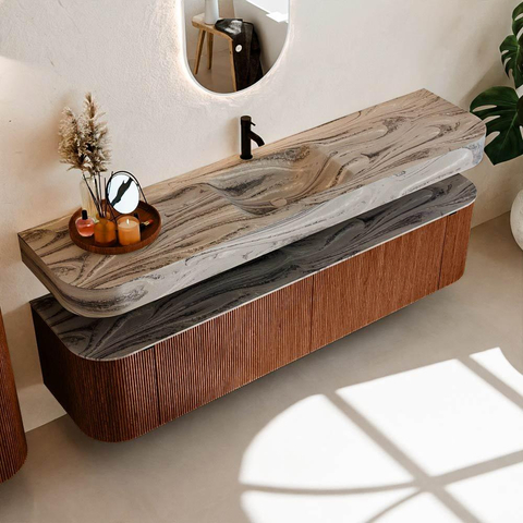 Matériaux naturels dans des tons chauds. Les nervures verticales apportent rythme et texture au design, tandis que le chêne confère une apparence chaleureuse et artisanale. Choisissez parmi 5 teintes de bois OAK, WALNUT, DUSK, SHADOW et RUBY, des couleurs de bois soigneusement sélectionnées pour enrichir les salles de bains modernes et classiques.