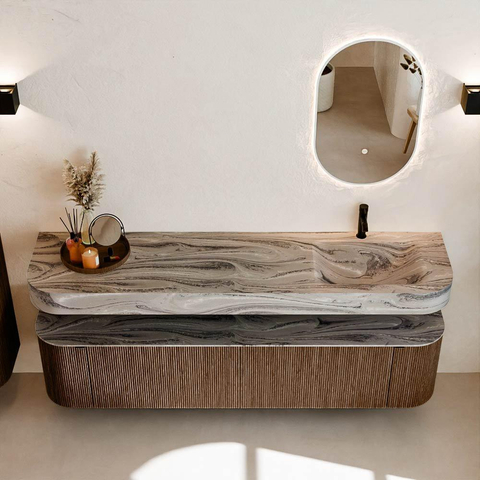 MONDIAZ THOR-DLUX 190cm meuble de salle de bains arrondi gauche + droite couleur Walnut avec 2 tiroirs et 2 portes. Vasque suspendue CLOUD Droite 1 trou de robinet couleur Sombra.