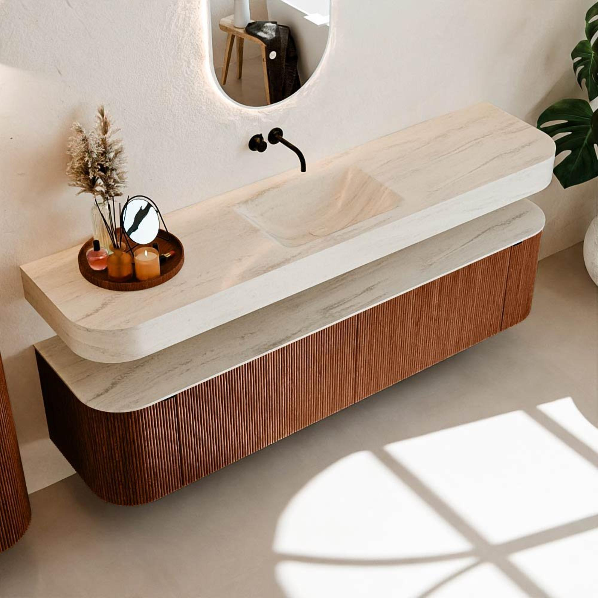 Au-dessus du meuble flotte une vasque suspendue assortie avec des coins arrondis – parfaitement adaptée à la forme du meuble. La vasque est réalisée en Solid Surface et suit subtilement les lignes du meuble inférieur, créant ainsi un ensemble harmonieux. Le plan de travail en Solid Surface forme une base solide, facile d'entretien, complétant la combinaison.