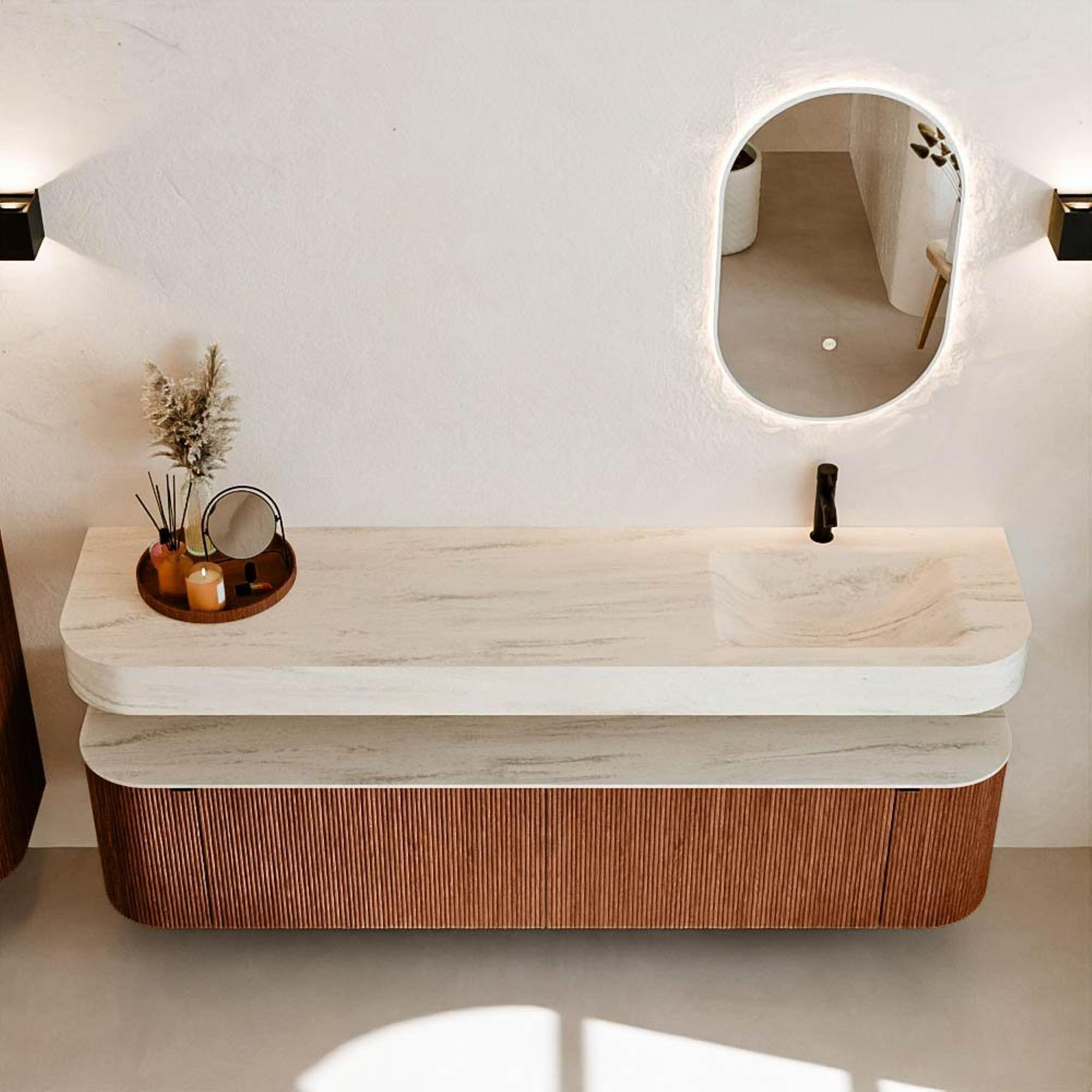 Au-dessus du meuble flotte une vasque suspendue assortie aux coins arrondis – parfaitement adaptée à la forme du meuble. La vasque est réalisée en Solid Surface et suit subtilement les lignes du meuble inférieur, créant un ensemble harmonieux. Le plan de travail en Solid Surface constitue une base solide et facile d'entretien, complétant la combinaison.