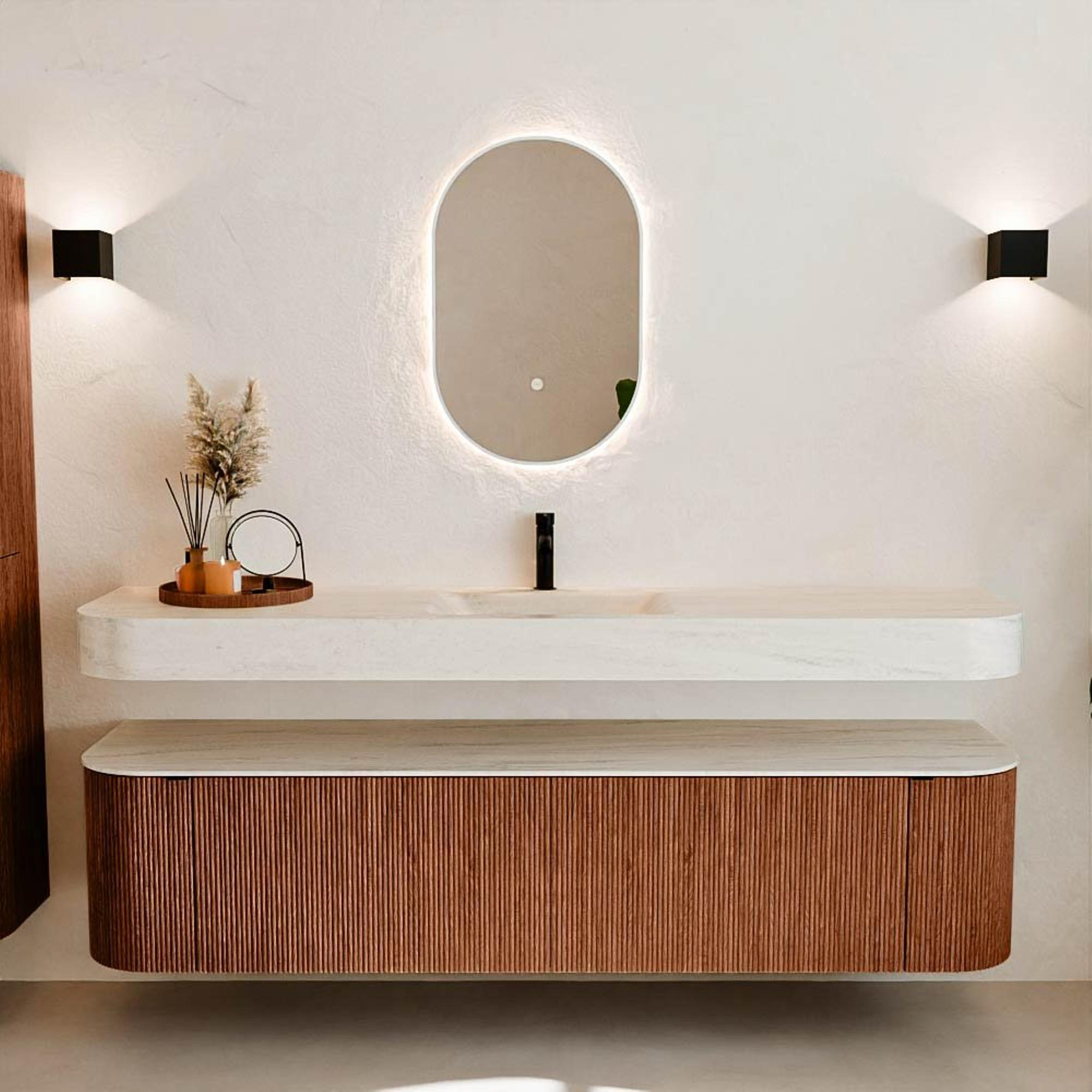 Matériaux naturels dans des tons chauds. Les reliefs verticaux apportent rythme et texture au design, tandis que le chêne confère une apparence chaleureuse et artisanale. Choisissez parmi 5 teintes de bois OAK, WALNUT, DUSK, SHADOW et RUBY, des couleurs de bois soigneusement sélectionnées pour enrichir les salles de bains modernes et classiques.