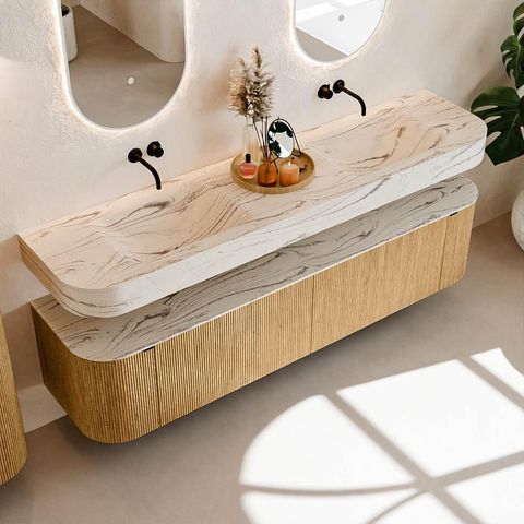 MONDIAZ THOR-DLUX 190cm meuble de salle de bains arrondi gauche + droite couleur Oak avec 2 tiroirs et 2 portes. Vasque suspendue CLOUD Double sans trou de robinet couleur Nata.