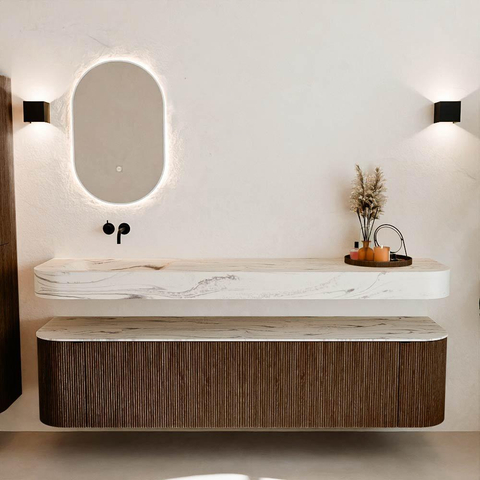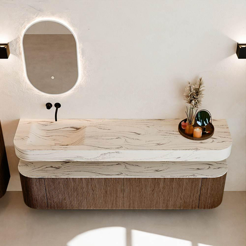 MONDIAZ THOR-DLUX 190cm meuble de salle de bains arrondi gauche + droite couleur Walnut avec 2 tiroirs et 2 portes. Vasque suspendue CLOUD Gauche sans trou de robinet couleur Nata.