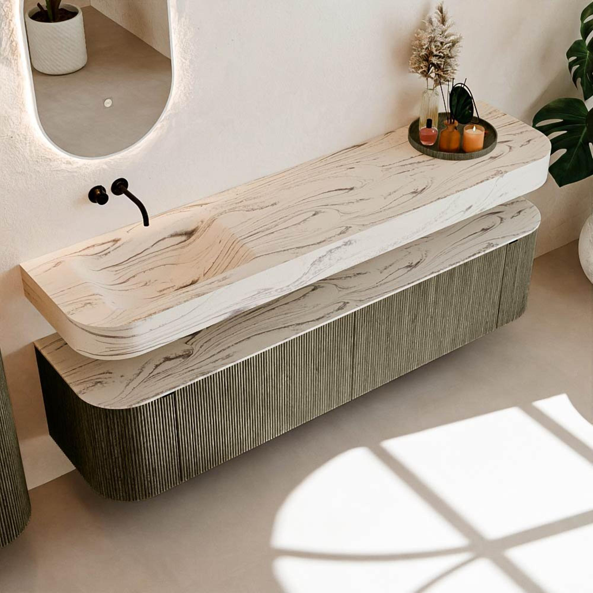 Au-dessus du meuble flotte une vasque suspendue assortie aux coins arrondis – parfaitement adaptée à la forme du meuble. La vasque est en Solid Surface et suit subtilement les lignes du meuble inférieur, créant ainsi un ensemble harmonieux. Le plan de travail en Solid Surface constitue une base solide et facile d'entretien, complétant la combinaison.