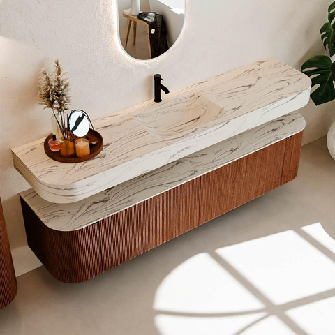 Au-dessus du meuble flotte une vasque suspendue assortie aux coins arrondis – parfaitement adaptée à la forme du meuble. La vasque est réalisée en Solid Surface et suit subtilement les lignes du meuble inférieur, créant ainsi un ensemble harmonieux. Le plan de travail en Solid Surface forme une base solide et facile d'entretien et complète la combinaison.