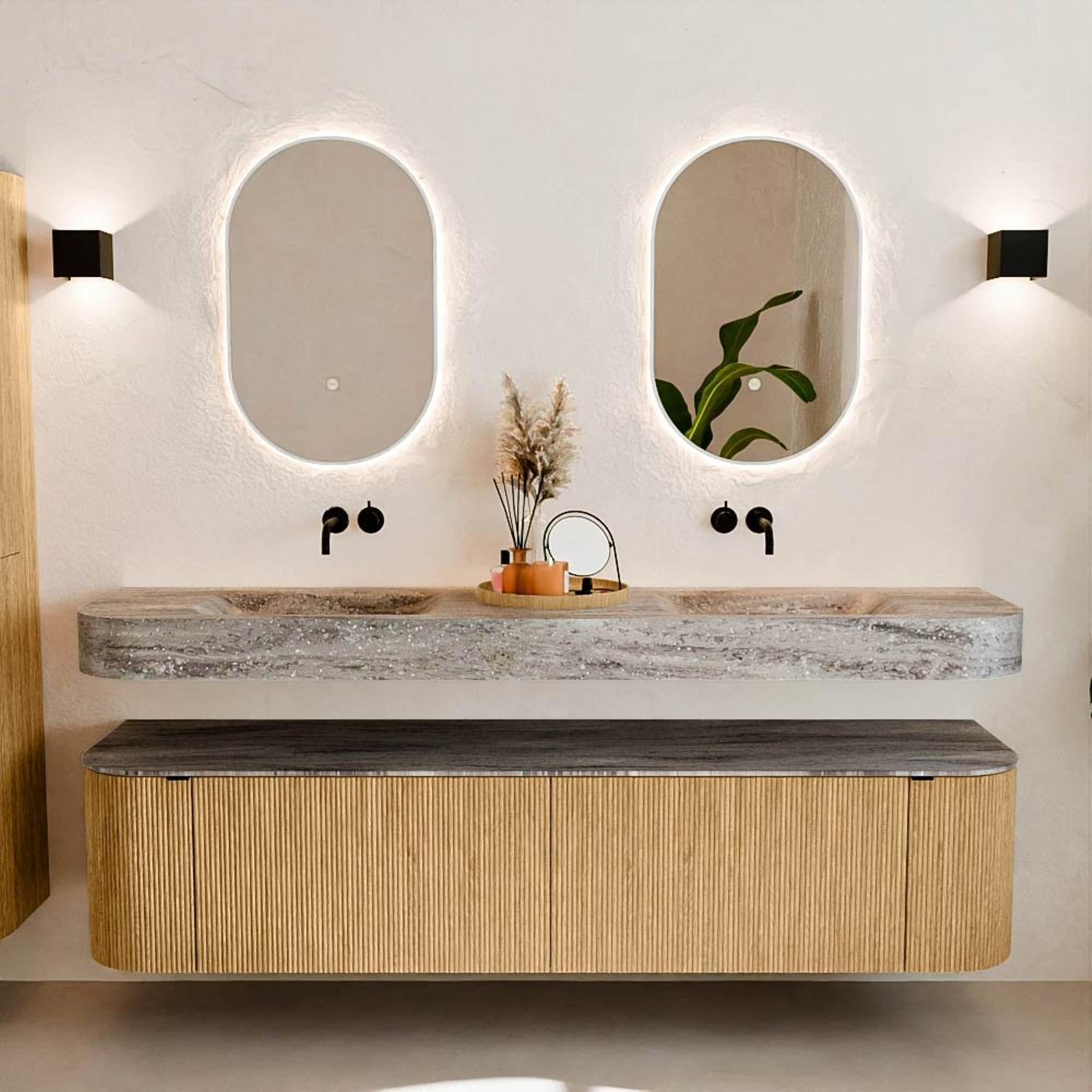 MONDIAZ THOR-DLUX Meuble de salle de bains - 190cm - arrondi gauche + droite - couleur Oak - 2 tiroirs et 2 portes - Vasque suspendue CLOUD Double sans trou de robinet - couleur Oza