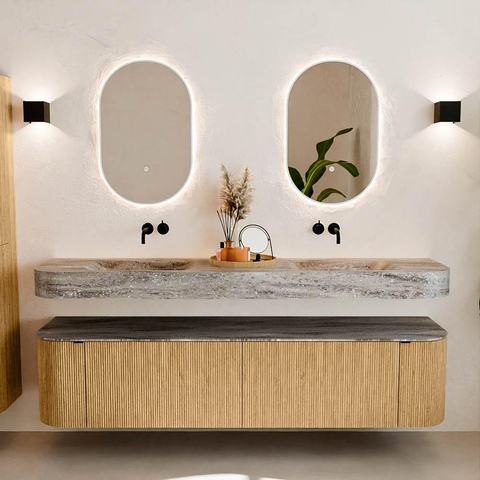 Matériaux naturels dans des tons chauds. Les reliefs verticaux apportent rythme et texture au design, tandis que le chêne confère une apparence chaleureuse et artisanale. Choisissez parmi 5 teintes de bois OAK, WALNUT, DUSK, SHADOW et RUBY, des couleurs de bois soigneusement sélectionnées pour enrichir les salles de bains modernes et classiques.