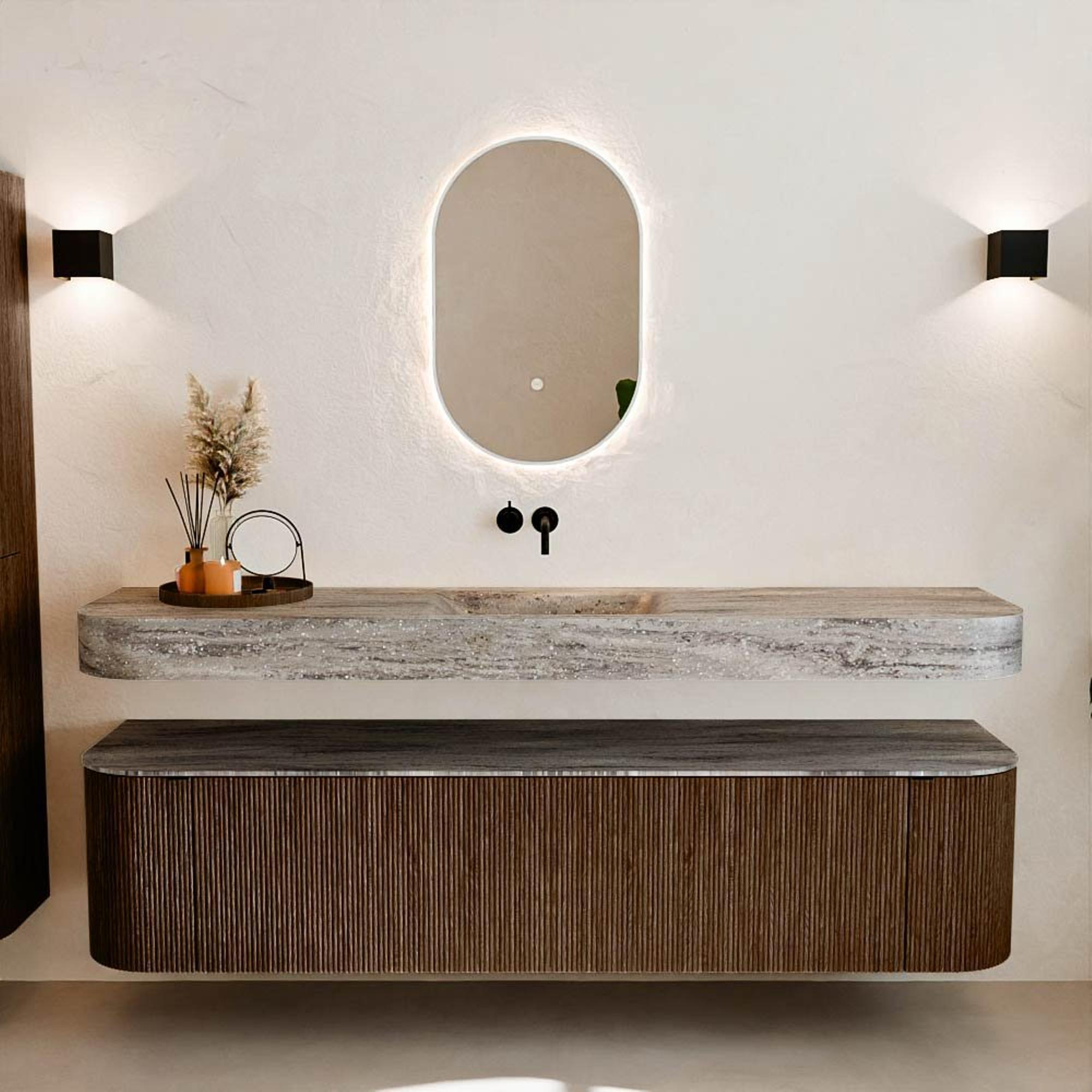 Matériaux naturels dans des tons chauds. Les nervures verticales apportent rythme et texture au design, tandis que le chêne confère une apparence chaleureuse et artisanale. Choisissez parmi 5 teintes de bois OAK, WALNUT, DUSK, SHADOW et RUBY, des couleurs de bois soigneusement sélectionnées pour enrichir les salles de bains modernes et classiques.