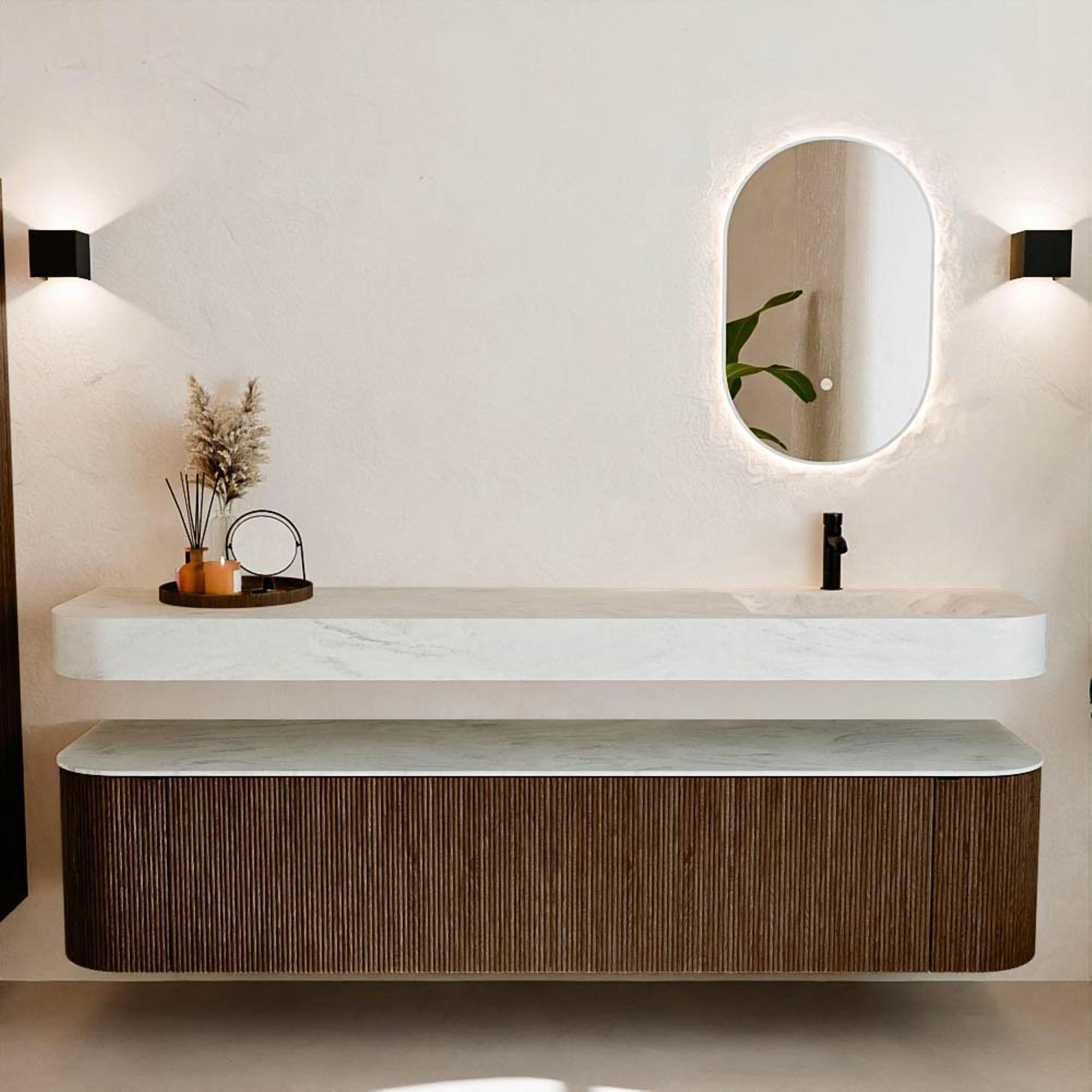 Au-dessus du meuble flotte une vasque suspendue assortie avec des coins arrondis – parfaitement adaptée à la forme du meuble. La vasque est réalisée en Solid Surface et suit subtilement les lignes du meuble inférieur, créant ainsi un ensemble harmonieux. Le plan de travail en Solid Surface constitue une base solide, facile d'entretien, et complète la combinaison.