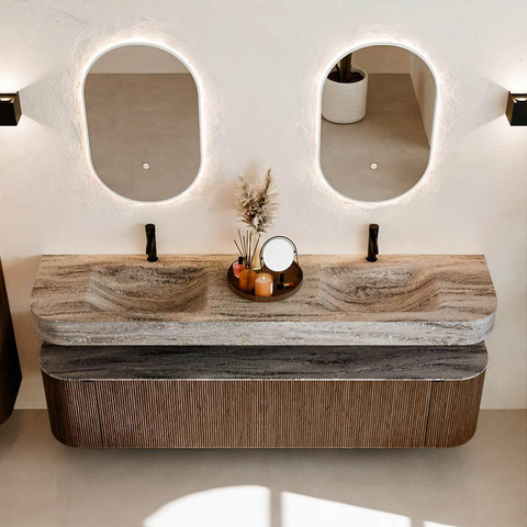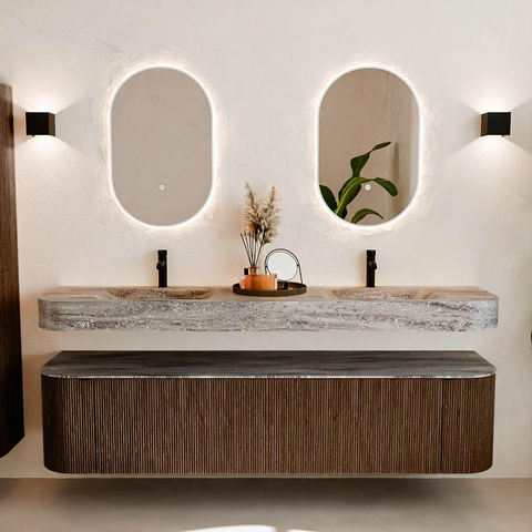Matériaux naturels dans des tons chauds. Les reliefs verticaux apportent rythme et texture au design, tandis que le chêne confère une apparence chaleureuse et artisanale. Choisissez parmi 5 teintes de bois OAK, WALNUT, DUSK, SHADOW et RUBY, des couleurs de bois soigneusement sélectionnées pour enrichir les salles de bains modernes et classiques.