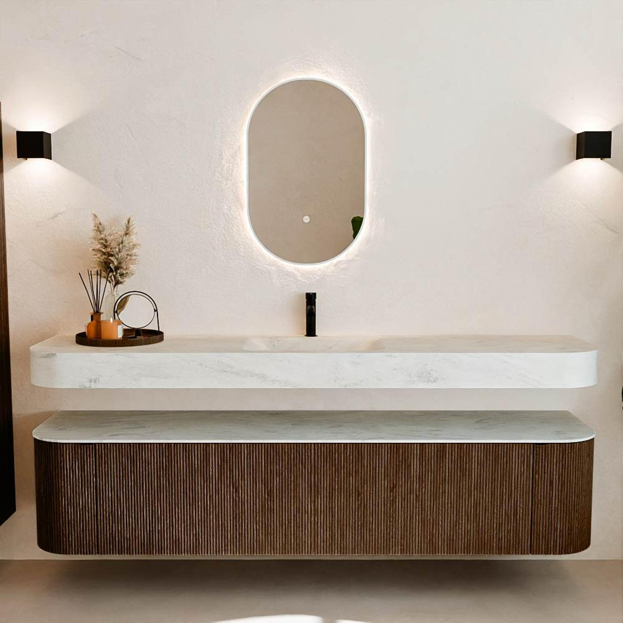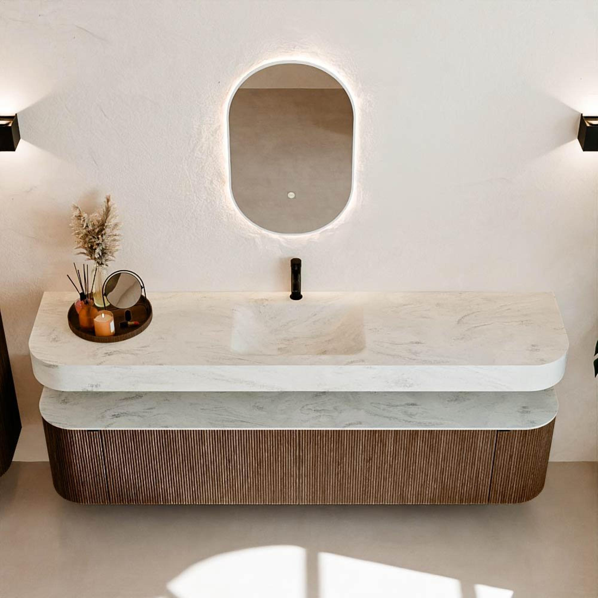 Au-dessus du meuble flotte une vasque suspendue assortie aux coins arrondis – parfaitement adaptée à la forme du meuble. La vasque est réalisée en Solid Surface et suit subtilement les lignes du meuble inférieur, créant un ensemble harmonieux. Le plan de travail en Solid Surface forme une base solide, facile d'entretien et complète la combinaison.
