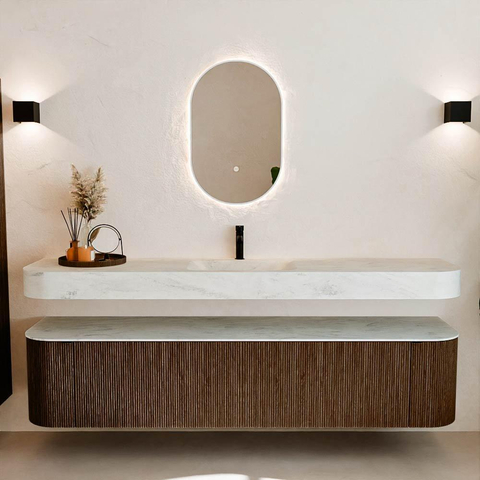 Matériaux naturels dans des tons chauds. Les nervures verticales apportent rythme et texture au design, tandis que le chêne confère une apparence chaleureuse et artisanale. Choisissez parmi 5 teintes de bois OAK, WALNUT, DUSK, SHADOW et RUBY, des couleurs de bois soigneusement sélectionnées pour enrichir les salles de bains modernes et classiques.