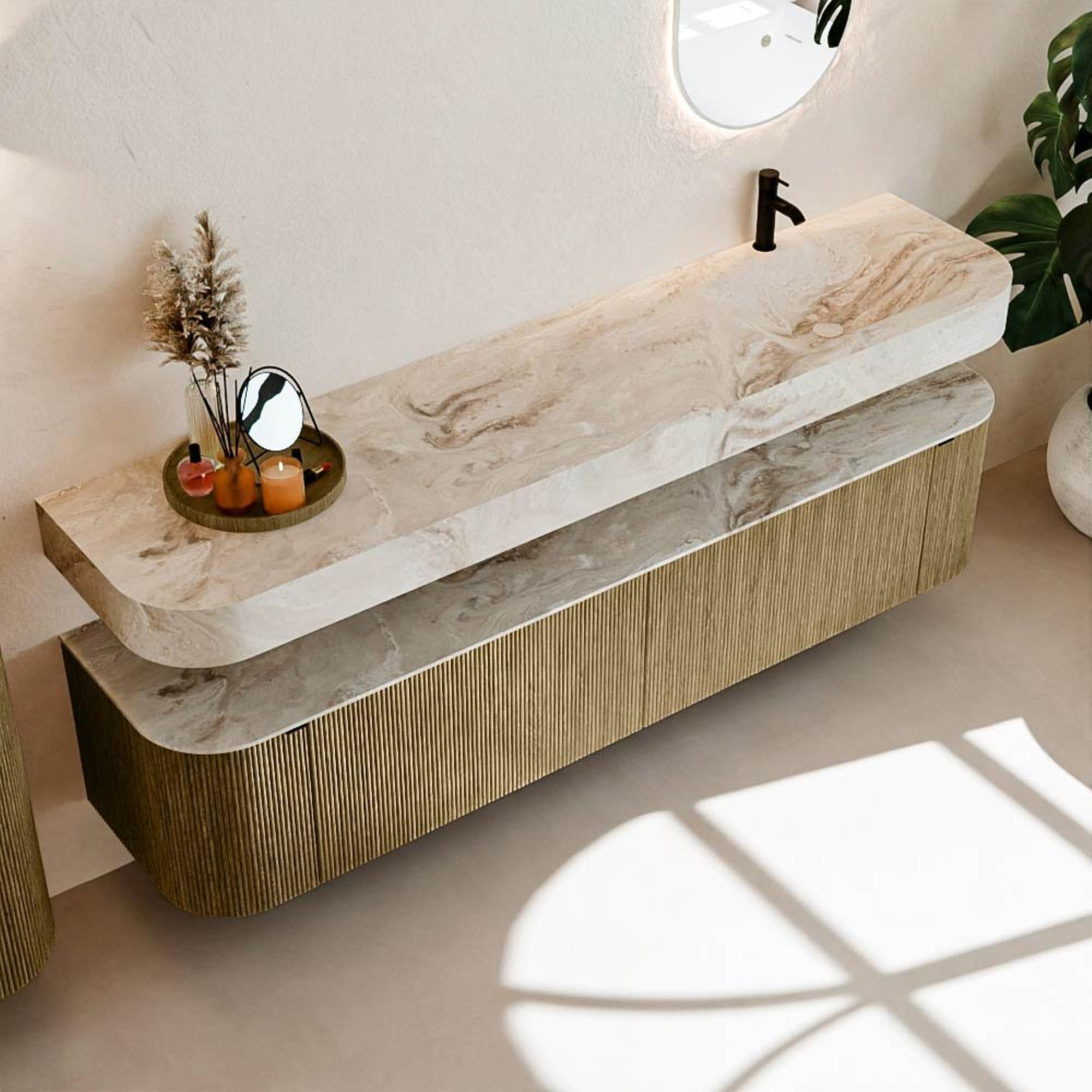 Au-dessus du meuble flotte une vasque suspendue assortie aux coins arrondis – parfaitement adaptée à la forme du meuble. La vasque est réalisée en Solid Surface et suit subtilement les lignes du meuble inférieur, créant ainsi un ensemble harmonieux. Le plan de travail en Solid Surface forme une base solide, facile d'entretien et complète la combinaison.