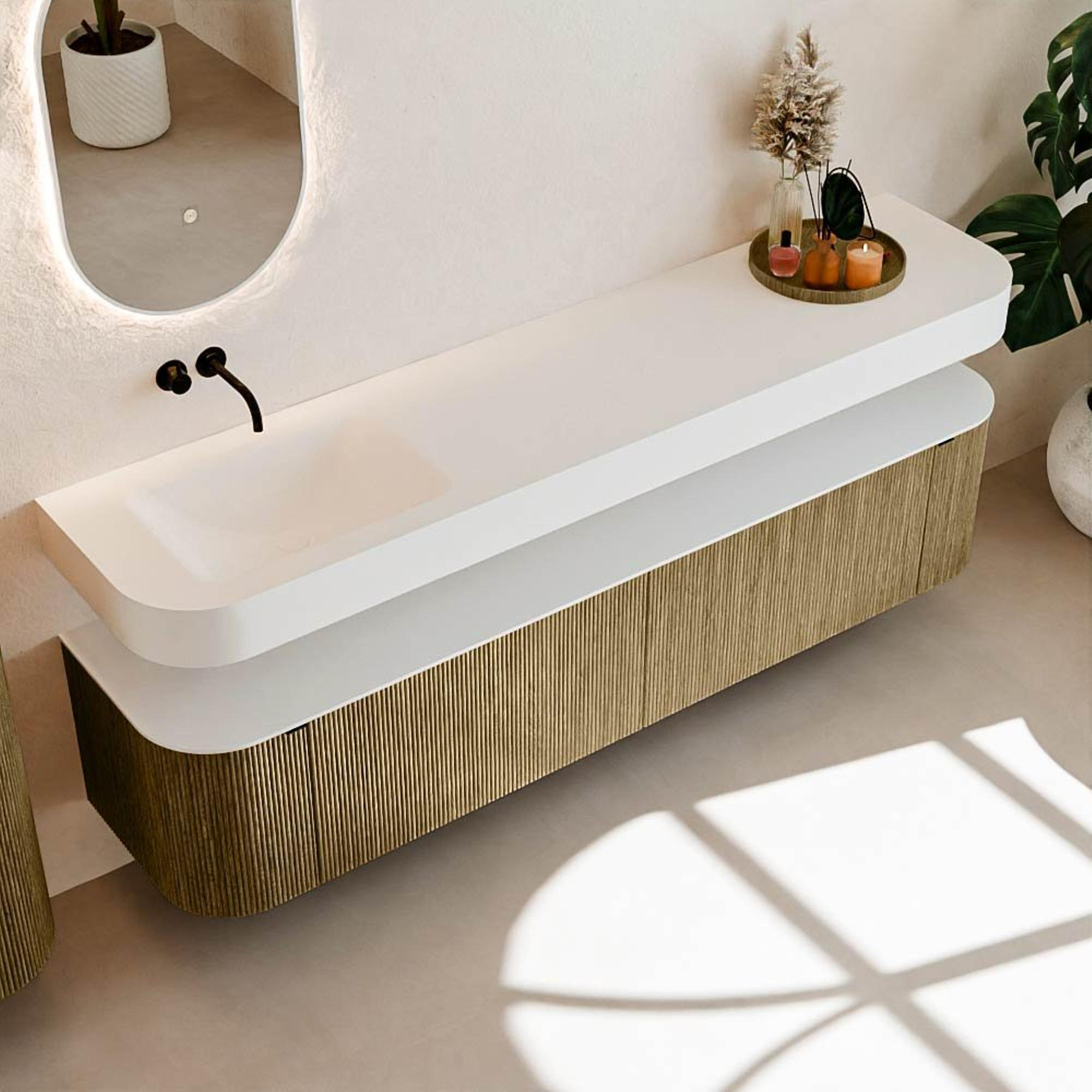 Au-dessus du meuble flotte une vasque suspendue assortie aux coins arrondis – parfaitement adaptée à la forme du meuble. La vasque est en Solid Surface et suit subtilement les lignes du meuble inférieur, créant un ensemble harmonieux. Le plan de travail en Solid Surface constitue une base solide et facile d’entretien, complétant la combinaison.