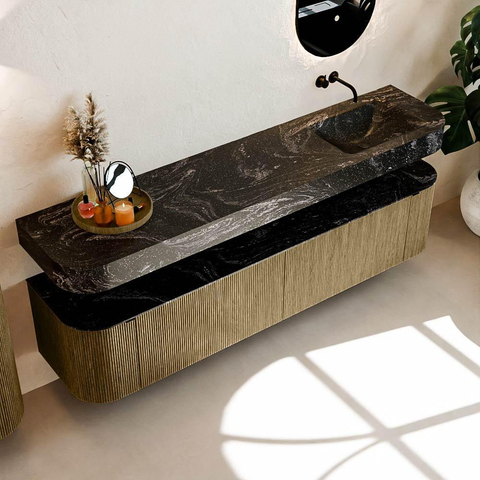 Matériaux naturels dans des tons chauds. Les nervures verticales apportent rythme et texture au design, tandis que le chêne confère une apparence chaleureuse et artisanale. Choisissez parmi 5 teintes de bois OAK, WALNUT, DUSK, SHADOW et RUBY, des couleurs de bois soigneusement sélectionnées pour enrichir les salles de bains modernes et classiques.