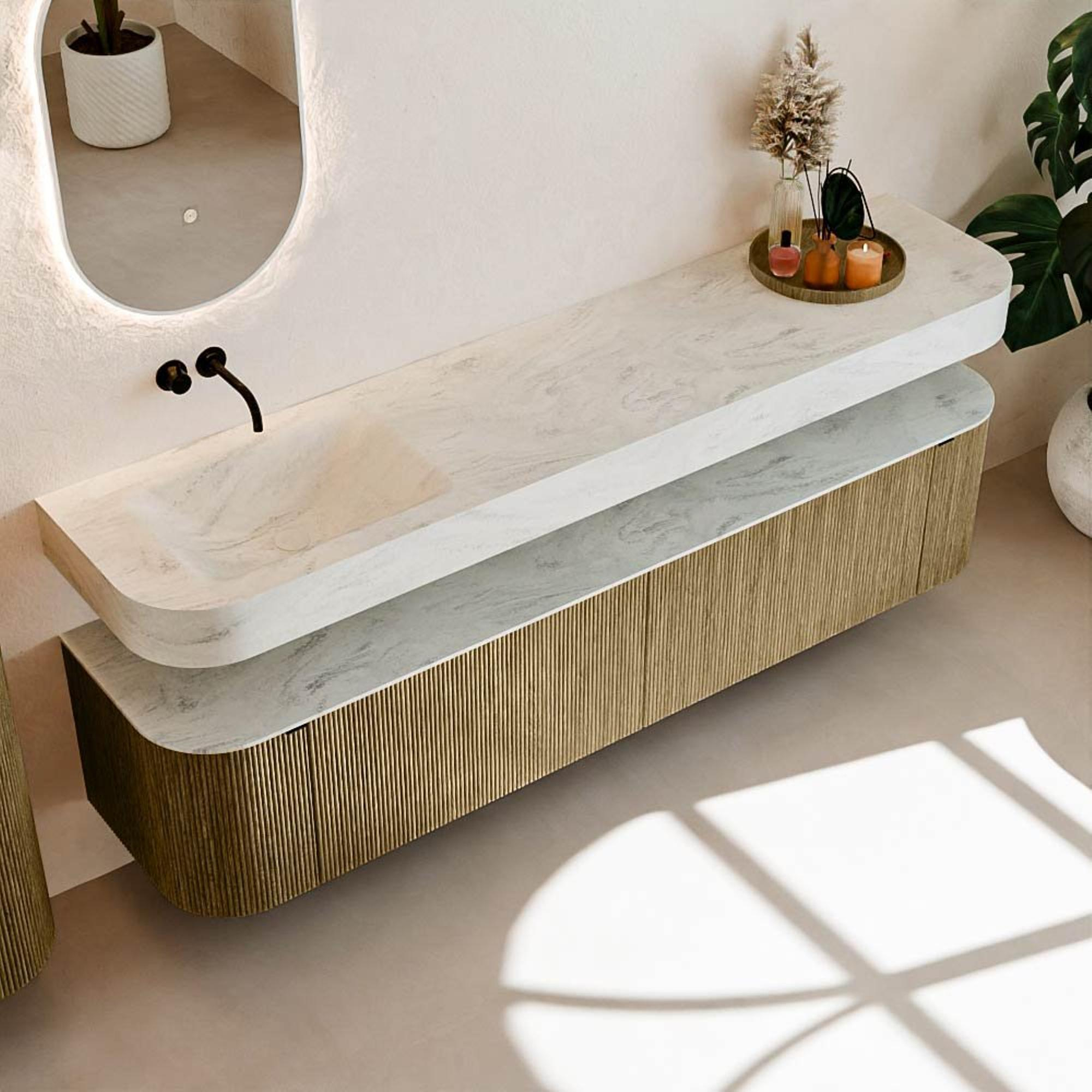 Au-dessus du meuble flotte une vasque suspendue assortie aux coins arrondis – parfaitement adaptée à la forme du meuble. La vasque est réalisée en Solid Surface et suit subtilement les lignes du meuble inférieur, créant ainsi un ensemble harmonieux. Le plan de travail en Solid Surface constitue une base solide et facile d'entretien, complétant la combinaison.
