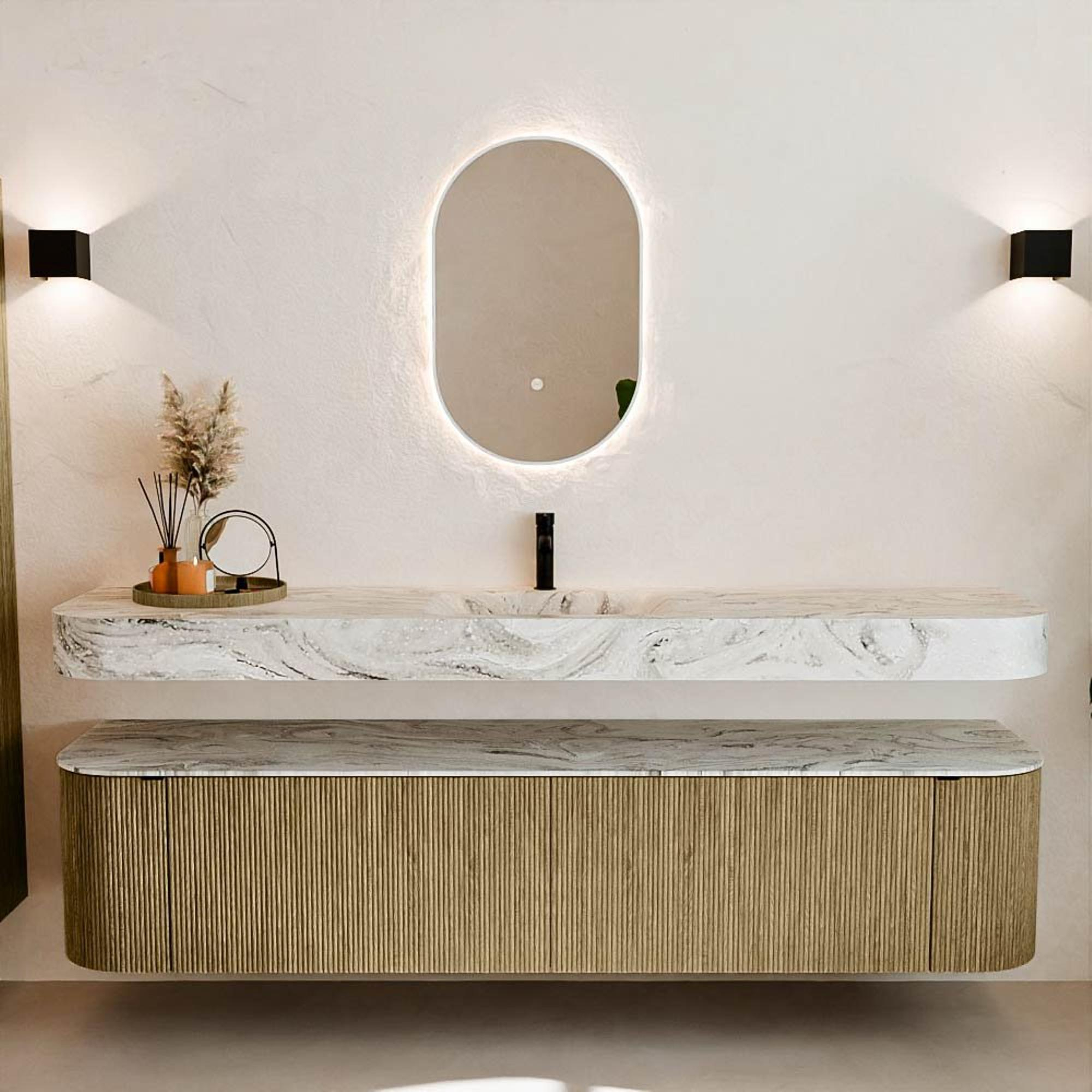 Matériaux naturels dans des tons chauds. Les nervures verticales apportent rythme et texture au design, tandis que le chêne confère une apparence chaleureuse et artisanale. Choisissez parmi 5 teintes de bois OAK, WALNUT, DUSK, SHADOW et RUBY, des couleurs de bois soigneusement sélectionnées pour enrichir les salles de bains modernes et classiques.