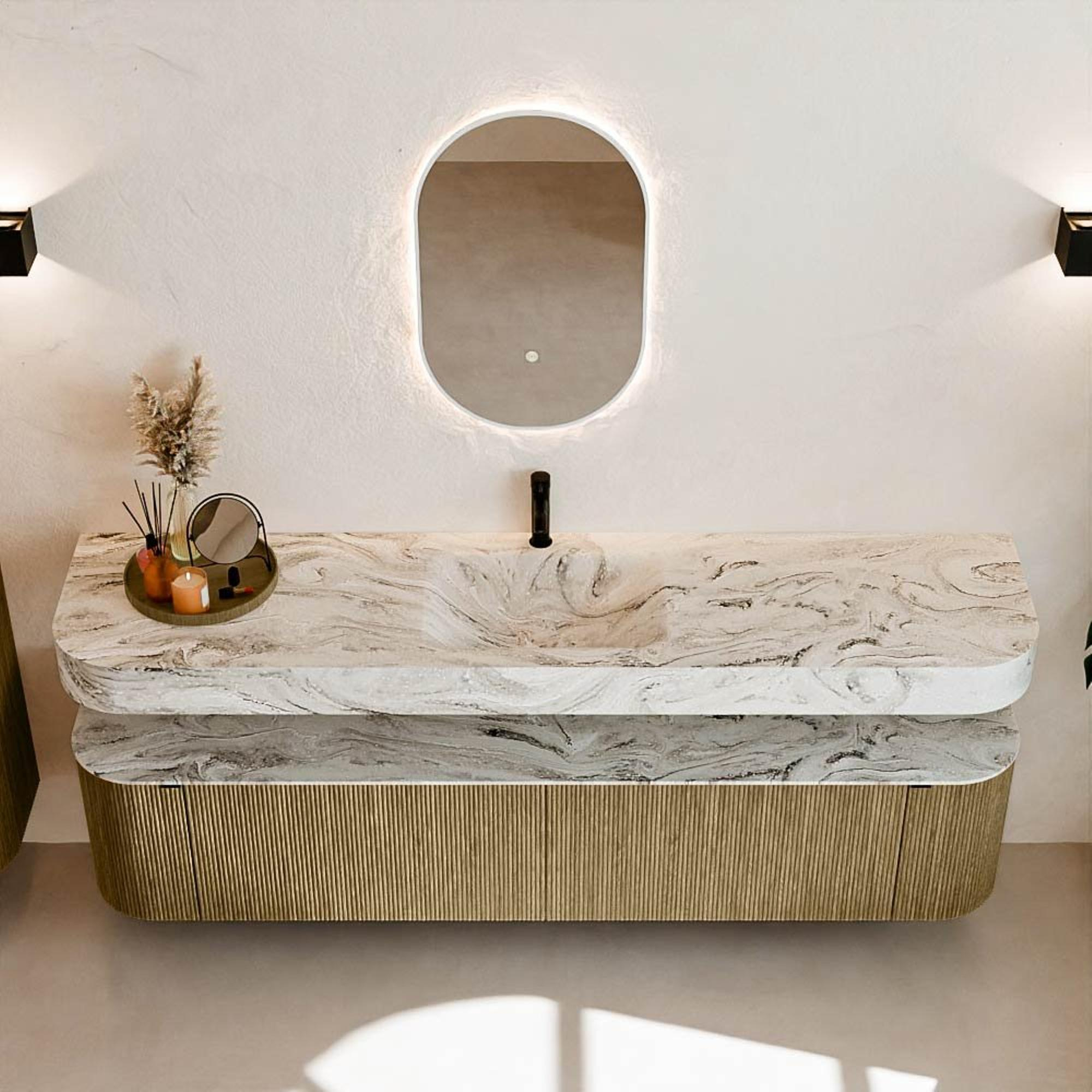 Au-dessus du meuble flotte une vasque suspendue assortie aux coins arrondis – parfaitement adaptée à la forme du meuble. La vasque est réalisée en Solid Surface et suit subtilement les lignes du meuble inférieur, créant ainsi un ensemble harmonieux. Le plan de travail en Solid Surface forme une base solide et facile d'entretien et complète la combinaison.
