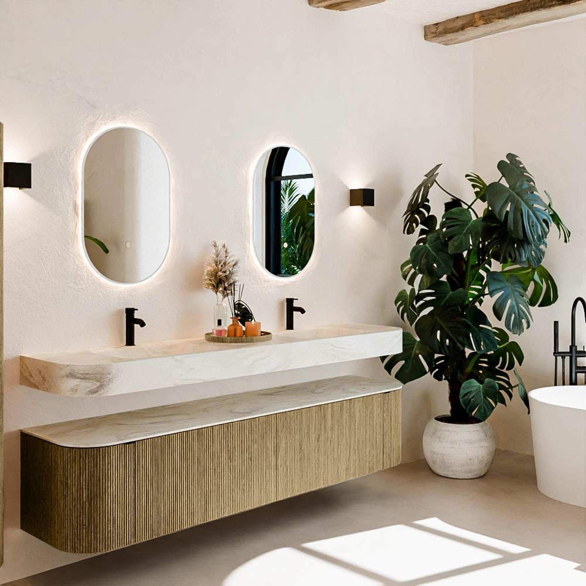 MONDIAZ THOR-DLUX 200cm meuble de salle de bains arrondi gauche + droite couleur Dusk avec 2 tiroirs et 2 portes. Vasque suspendue CLOUD Double 2 trous de robinet couleur Ostra.