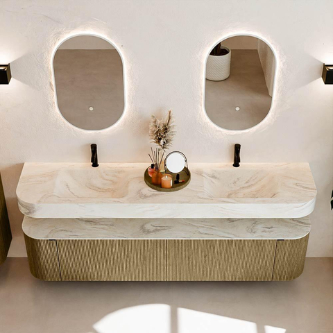 Au-dessus du meuble flotte une vasque suspendue assortie aux coins arrondis – parfaitement adaptée à la forme du meuble. La vasque est en Solid Surface et suit subtilement les lignes du meuble inférieur, créant ainsi un ensemble harmonieux. Le plan de travail en Solid Surface constitue une base solide et facile d'entretien, complétant la combinaison.