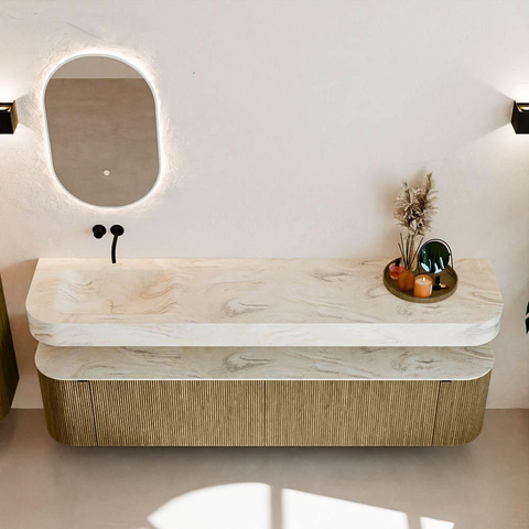 Au-dessus du meuble flotte une vasque suspendue assortie aux coins arrondis – parfaitement adaptée à la forme du meuble. La vasque est réalisée en Solid Surface et suit subtilement les lignes du meuble inférieur, créant ainsi un ensemble harmonieux. Le plan de travail en Solid Surface forme une base solide, facile d'entretien, et complète la combinaison.