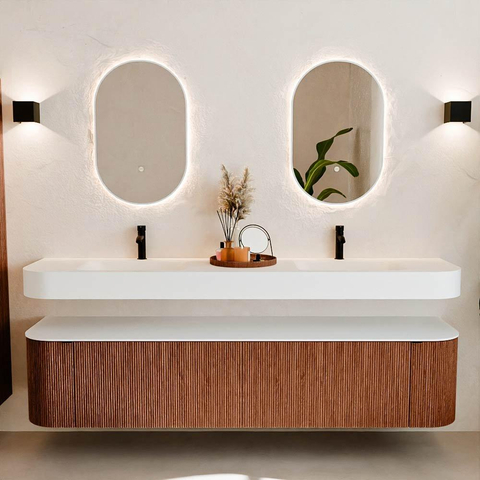 Matériaux naturels dans des tons chauds. Les nervures verticales apportent rythme et texture au design, tandis que le chêne confère une apparence chaleureuse et artisanale. Choisissez parmi 5 teintes de bois OAK, WALNUT, DUSK, SHADOW et RUBY, des couleurs de bois soigneusement sélectionnées pour enrichir les salles de bains modernes et classiques.