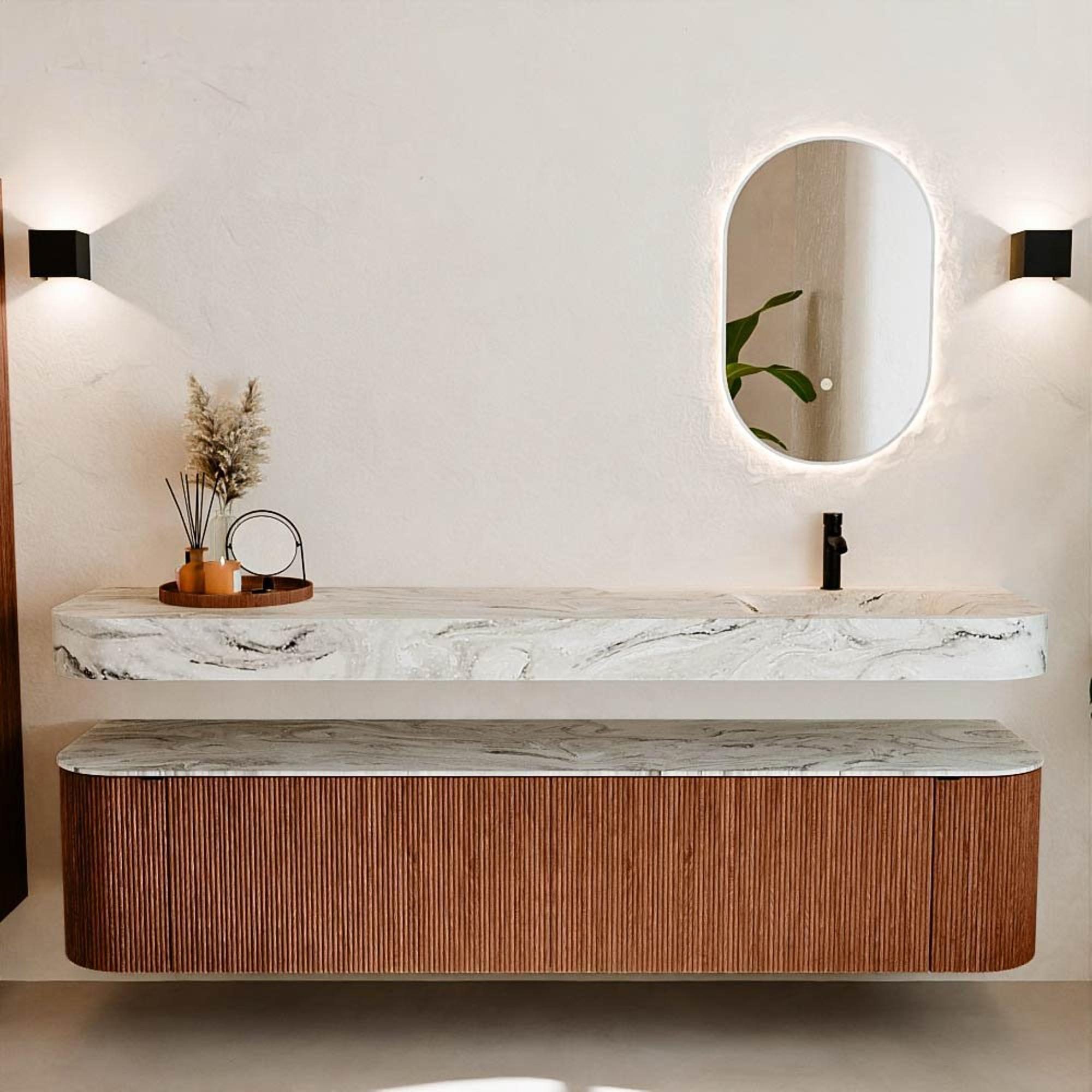 Au-dessus du meuble flotte une vasque suspendue assortie avec des coins arrondis – parfaitement adaptée à la forme du meuble. La vasque est réalisée en Solid Surface et suit subtilement les lignes du meuble inférieur, créant ainsi un ensemble harmonieux. Le plan de travail en Solid Surface forme une base solide, facile d'entretien et complète la combinaison.