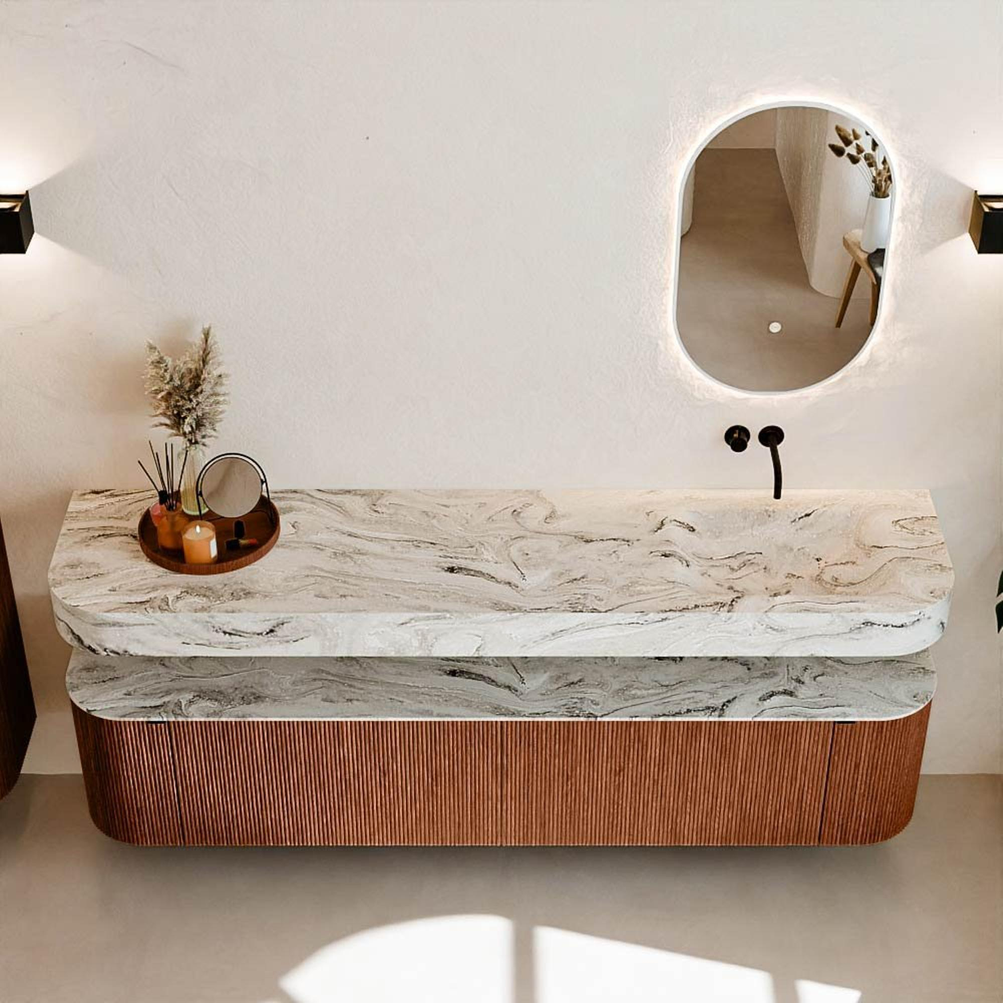 Au-dessus du meuble flotte une vasque suspendue assortie aux coins arrondis – parfaitement adaptée à la forme du meuble. La vasque est réalisée en Solid Surface et suit subtilement les lignes du meuble inférieur, créant une harmonie parfaite. Le plan de travail en Solid Surface constitue une base solide et facile d'entretien, complétant l'ensemble.