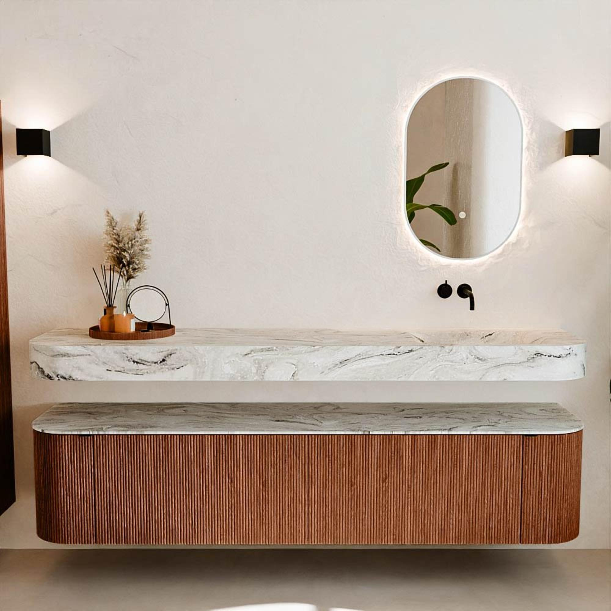 Matériaux naturels dans des tons chauds. Les nervures verticales apportent rythme et texture au design, tandis que le chêne confère une apparence chaleureuse et artisanale. Choisissez parmi 5 teintes de bois OAK, WALNUT, DUSK, SHADOW et RUBY, des couleurs de bois soigneusement sélectionnées pour enrichir les salles de bains modernes et classiques.
