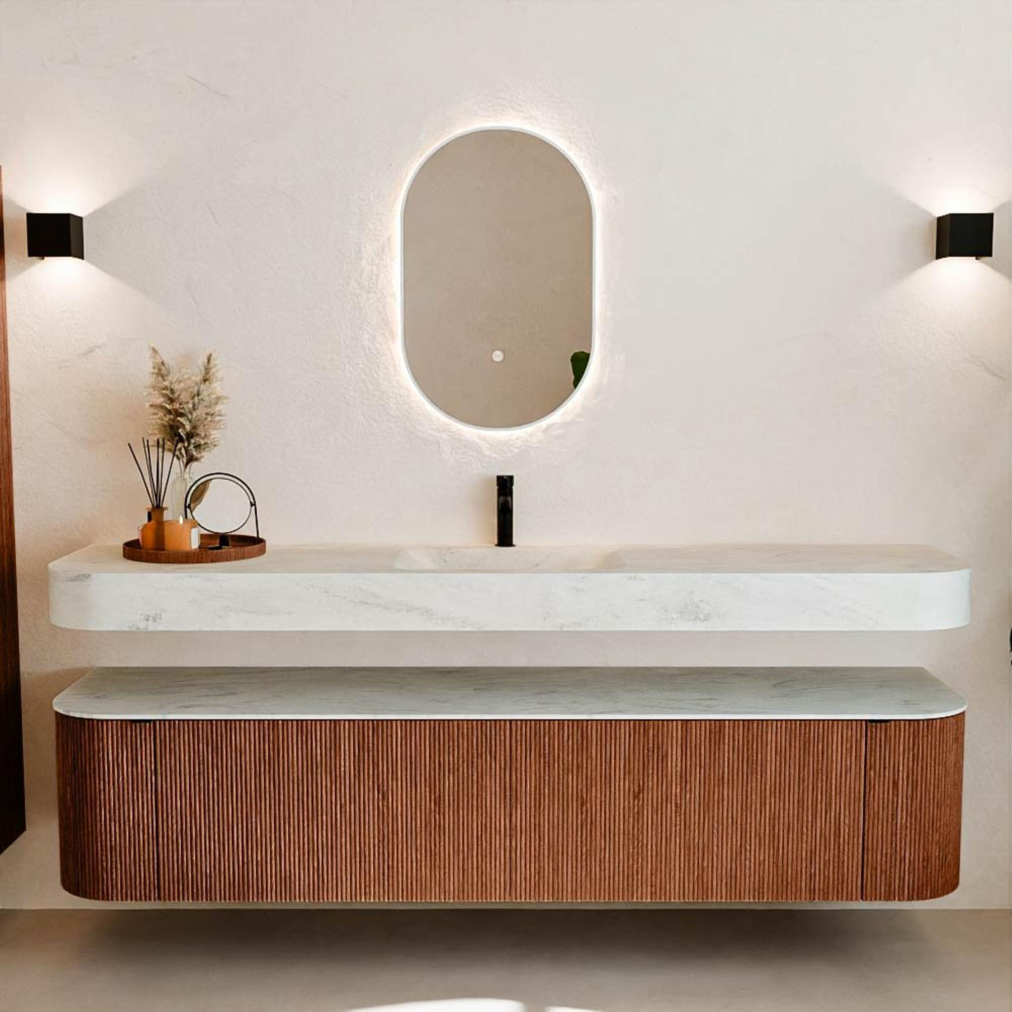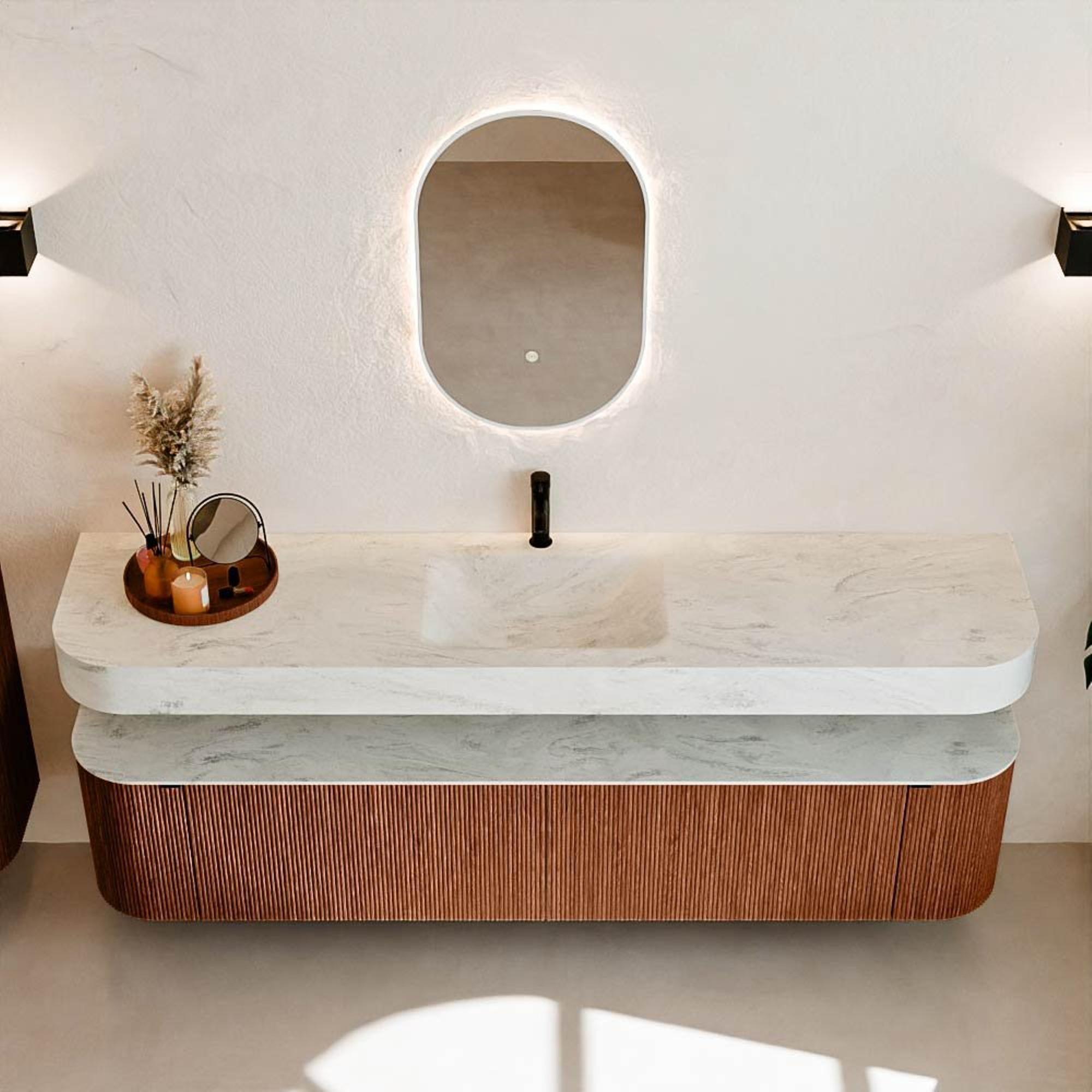 Au-dessus du meuble flotte une vasque suspendue assortie aux coins arrondis – parfaitement adaptée à la forme du meuble. La vasque est réalisée en Solid Surface et suit subtilement les lignes du meuble inférieur, créant ainsi un ensemble harmonieux. Le plan de travail en Solid Surface constitue une base solide, facile d'entretien, et complète la combinaison.