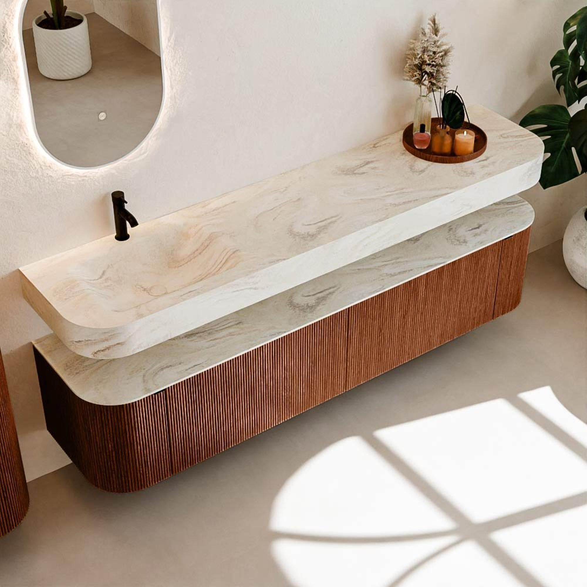 Au-dessus du meuble flotte une vasque suspendue assortie aux coins arrondis – parfaitement adaptée à la forme du meuble. La vasque est réalisée en Solid Surface et suit subtilement les lignes du meuble inférieur, créant ainsi un ensemble harmonieux. Le plan de travail en Solid Surface constitue une base solide et facile d'entretien et complète la combinaison.