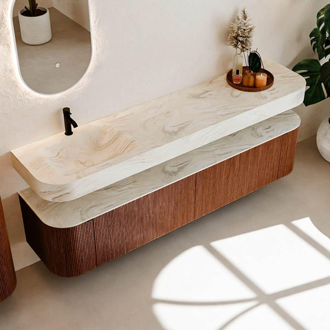 Matériaux naturels dans des tons chauds. Les nervures verticales apportent rythme et texture au design, tandis que le chêne confère une apparence chaleureuse et artisanale. Choisissez parmi 5 teintes de bois OAK, WALNUT, DUSK, SHADOW et RUBY, des couleurs de bois soigneusement sélectionnées pour enrichir les salles de bains modernes et classiques.
