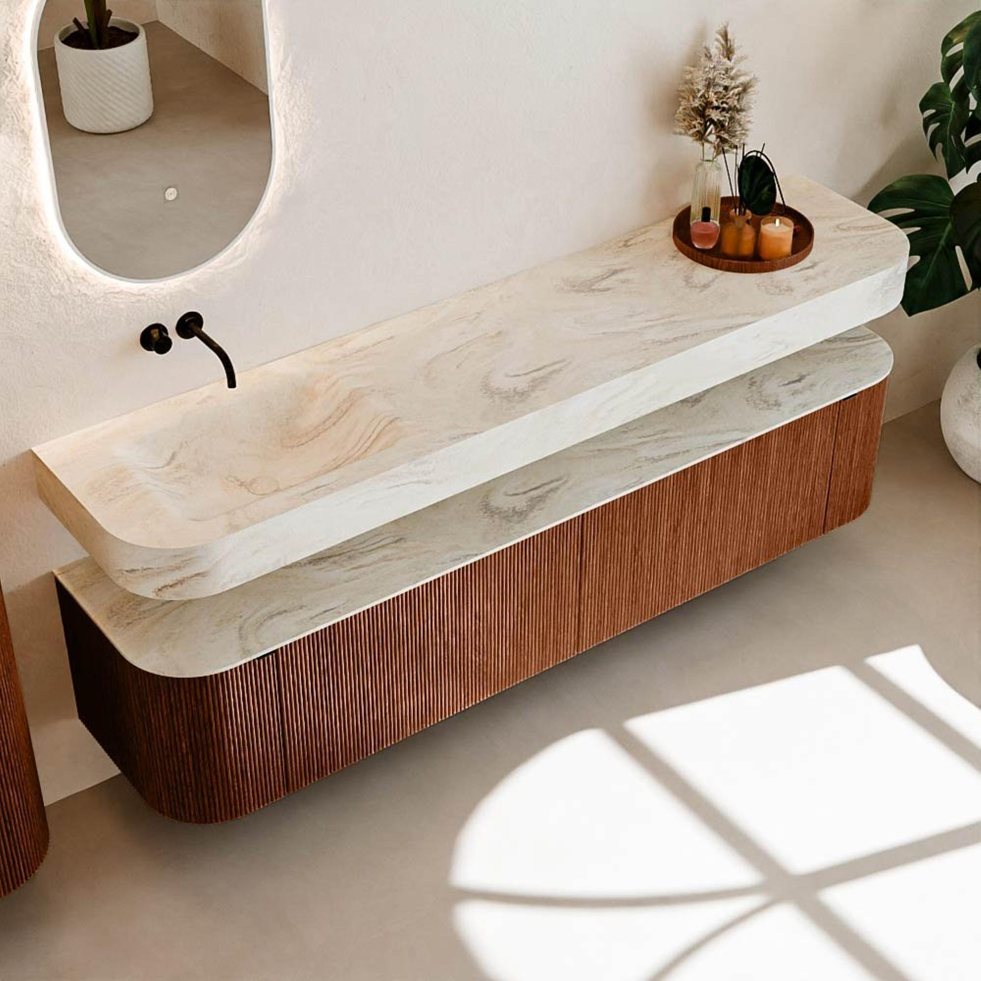 Au-dessus du meuble flotte une vasque suspendue assortie aux coins arrondis – parfaitement adaptée à la forme du meuble. La vasque est réalisée en Solid Surface et suit subtilement les lignes du meuble inférieur, créant ainsi un ensemble harmonieux. Le plan de travail en Solid Surface forme une base solide et facile d'entretien et complète la combinaison.