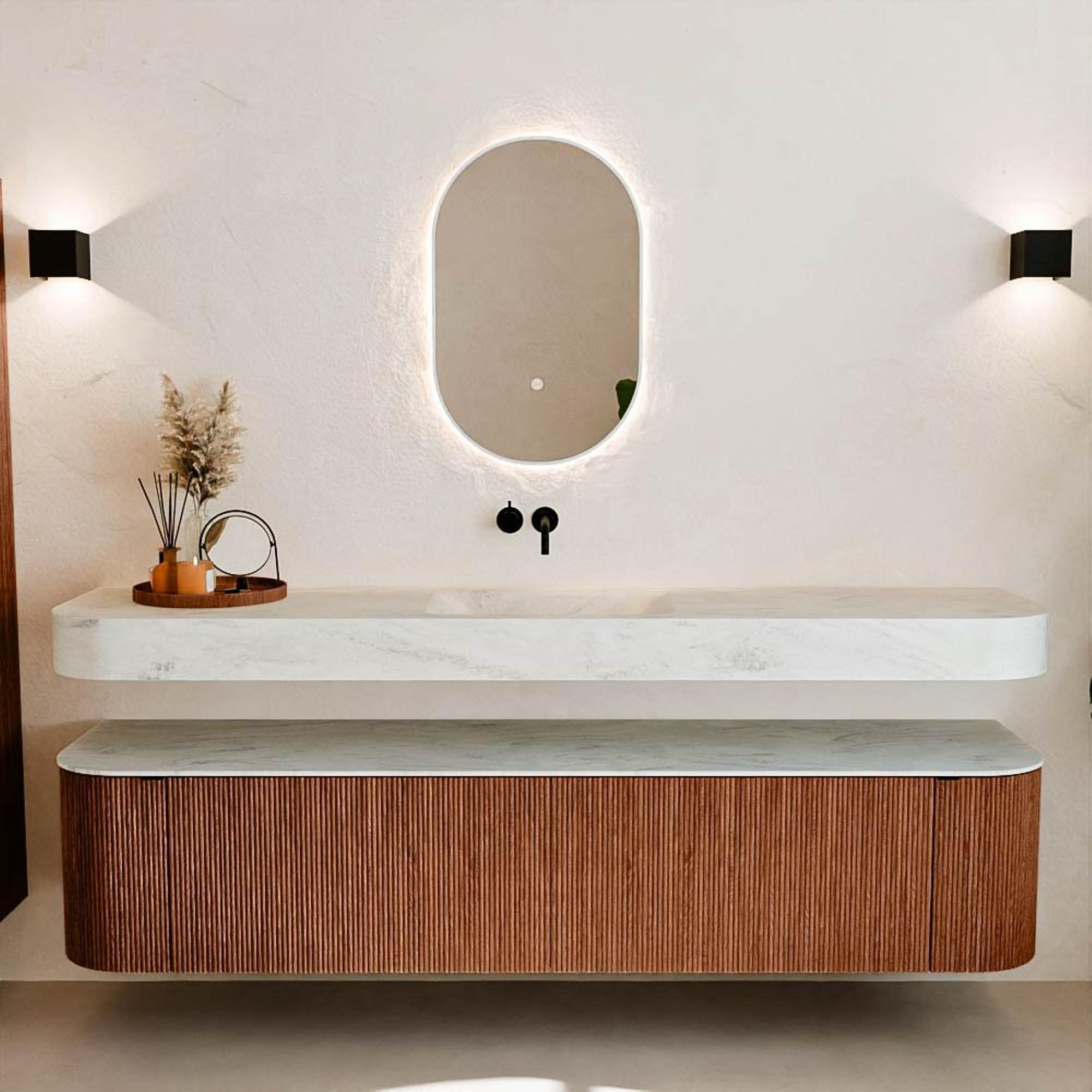 Matériaux naturels dans des tons chauds. Les nervures verticales apportent rythme et texture au design, tandis que le chêne confère une apparence chaleureuse et artisanale. Choisissez parmi 5 teintes de bois OAK, WALNUT, DUSK, SHADOW et RUBY, des couleurs de bois soigneusement sélectionnées pour enrichir les salles de bains modernes et classiques.
