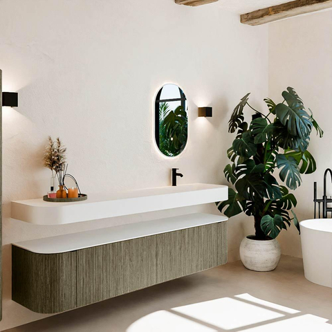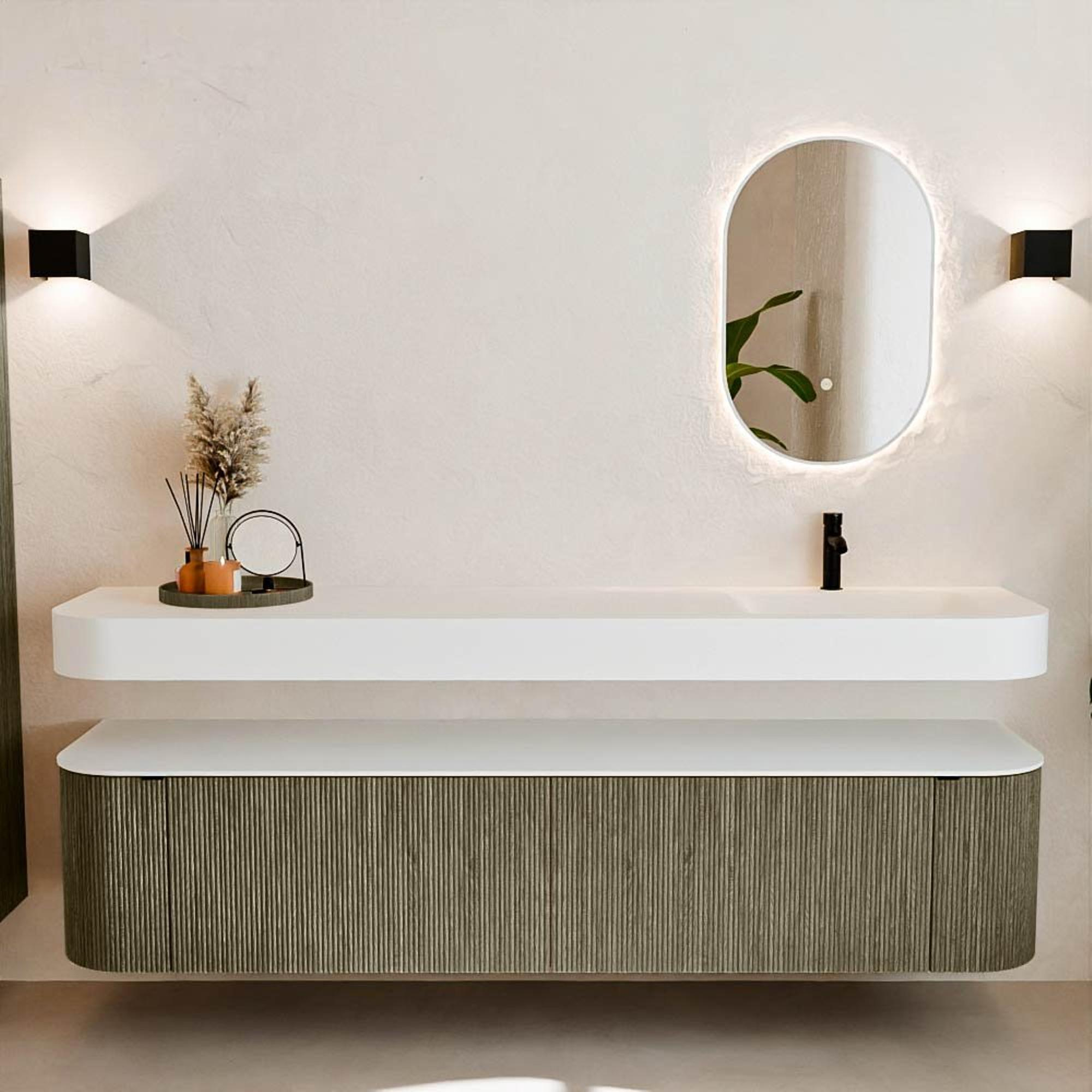 Au-dessus du meuble flotte une vasque suspendue assortie aux coins arrondis – parfaitement adaptée à la forme du meuble. La vasque est réalisée en Solid Surface et suit subtilement les lignes du meuble inférieur, créant ainsi un ensemble harmonieux. Le plan de travail en Solid Surface forme une base solide et facile d'entretien et complète la combinaison.