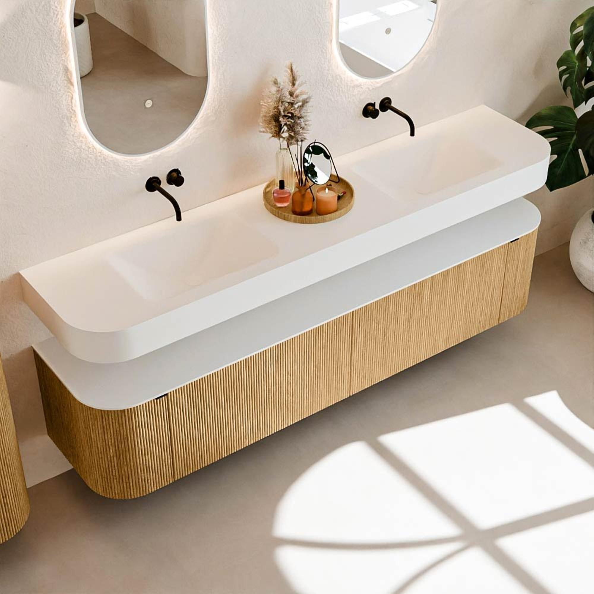 Au-dessus du meuble flotte une vasque suspendue assortie aux coins arrondis – parfaitement adaptée à la forme du meuble. La vasque est en Solid Surface et suit subtilement les lignes du meuble inférieur, créant un ensemble harmonieux. Le plan de travail en Solid Surface constitue une base solide et facile d’entretien, complétant la combinaison.