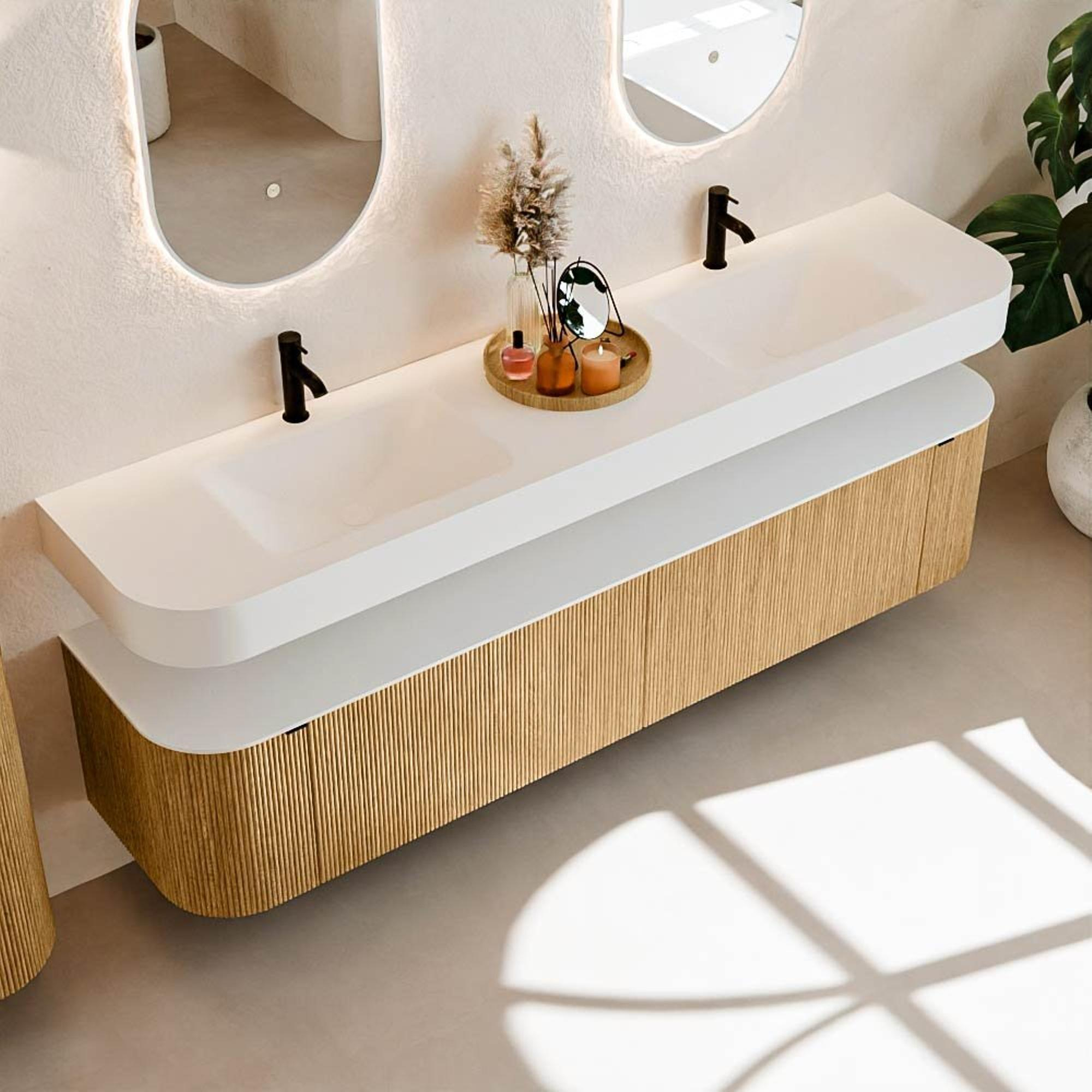 Au-dessus du meuble flotte une vasque suspendue assortie aux angles arrondis – parfaitement adaptée à la forme du meuble. La vasque est en Solid Surface et suit subtilement les lignes du meuble inférieur, créant une harmonie parfaite. Le plan de travail en Solid Surface forme une base solide, facile d'entretien et complète la combinaison.