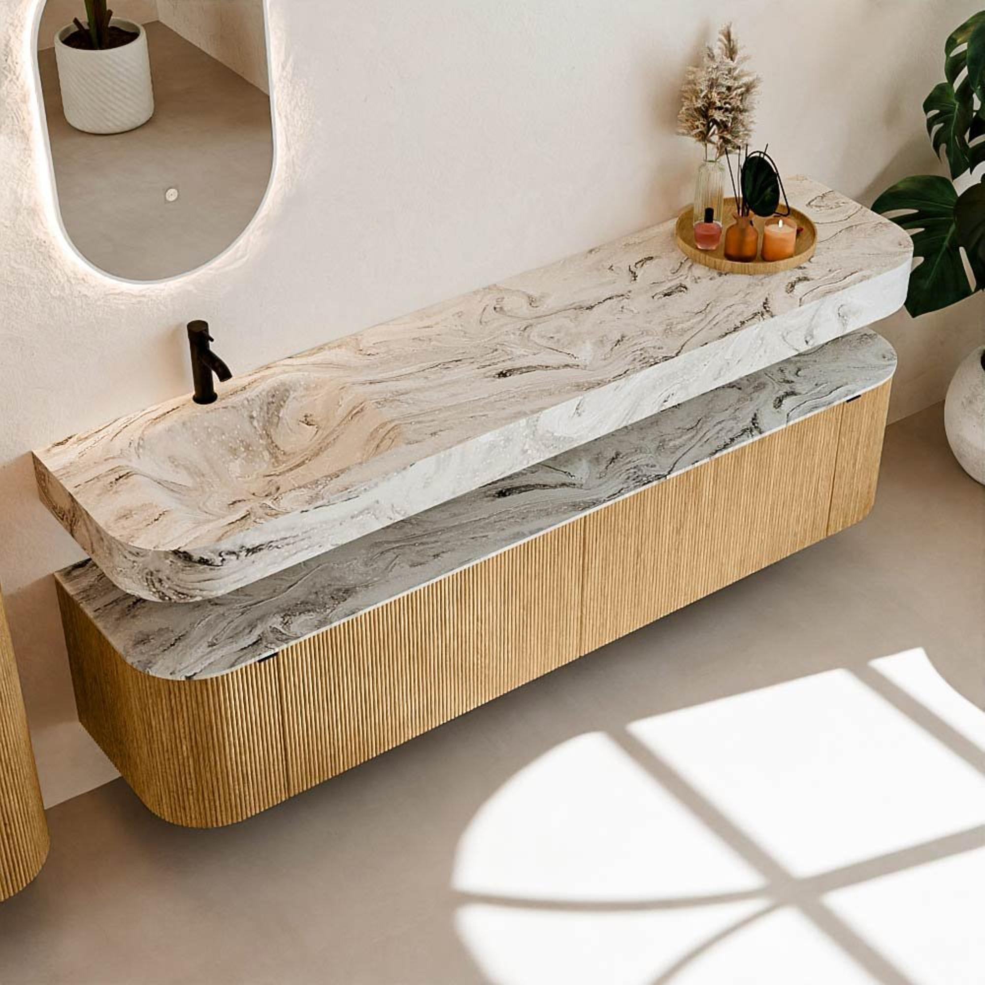 Au-dessus du meuble flotte une vasque suspendue assortie aux coins arrondis – parfaitement adaptée à la forme du meuble. La vasque est réalisée en Solid Surface et suit subtilement les lignes du meuble inférieur, créant ainsi un ensemble harmonieux. Le plan de travail en Solid Surface forme une base solide, facile d'entretien, et complète la combinaison.