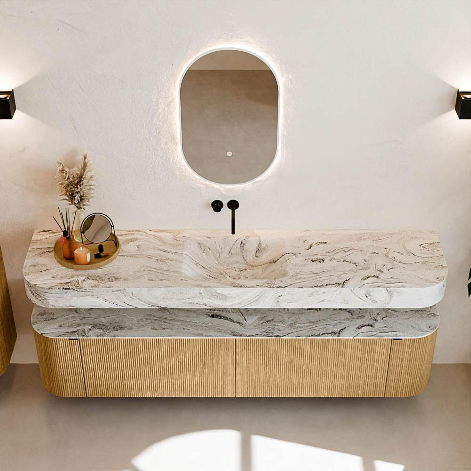 MONDIAZ THOR-DLUX 200cm meuble de salle de bains arrondi gauche + droite couleur Oak avec 2 tiroirs et 2 portes. Vasque suspendue CLOUD Milieu sans trou de robinet couleur Glace.